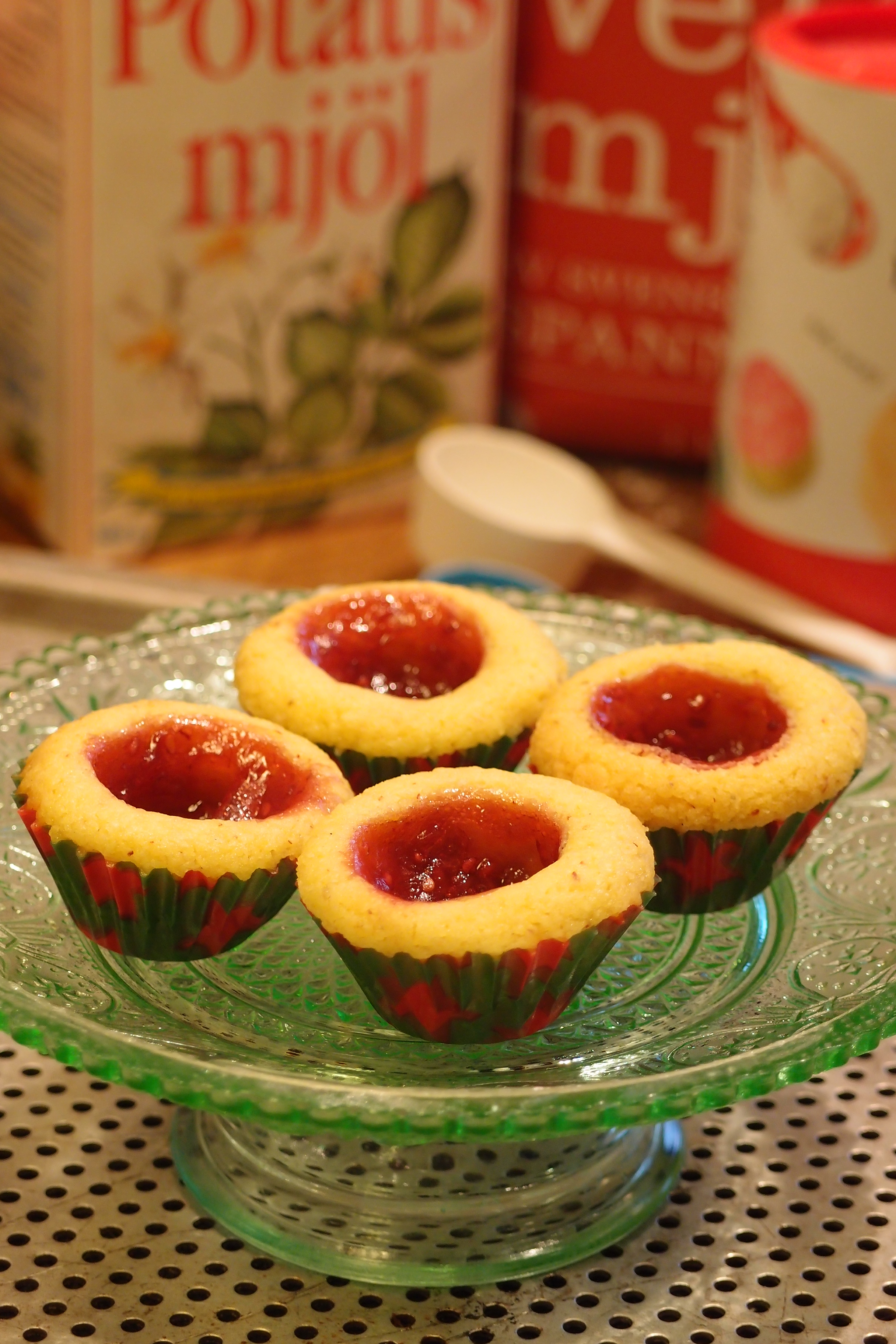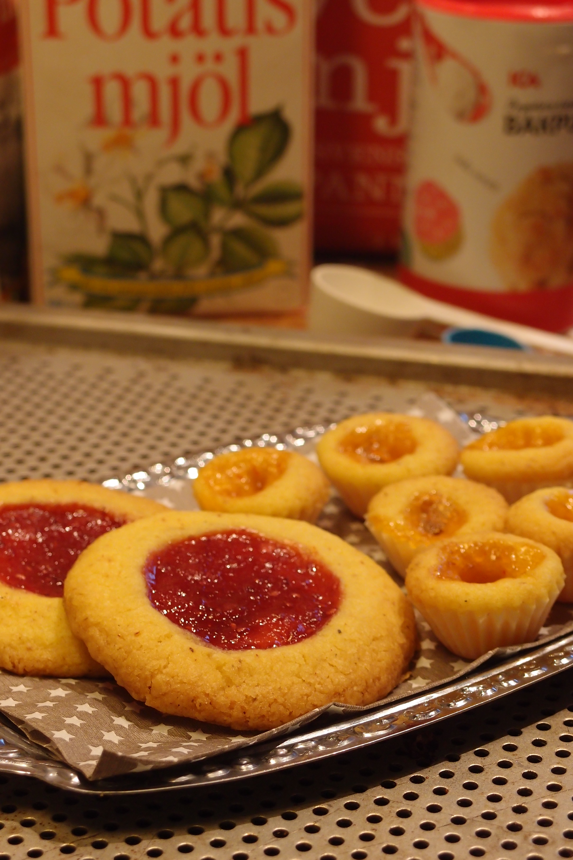 De här saffransgrottorna smakar verkligen saffran. Det är viktigt att använda en fast sylt med mycket smak och snåla inte med mängden sylt, den sjunker undan under gräddningen. Om din sylt känns rinnig så låt den rinna av i ett kaffefilter innan du fyller kakorna. Jag provade baka ut dem i olika formar och storlekar. De flöt ut ganska mycket utan form så var beredd på det. Ta gärna dubbla pappersformar och välj storlek själv. De blir rätt söta små munsbitar i knäckformar.