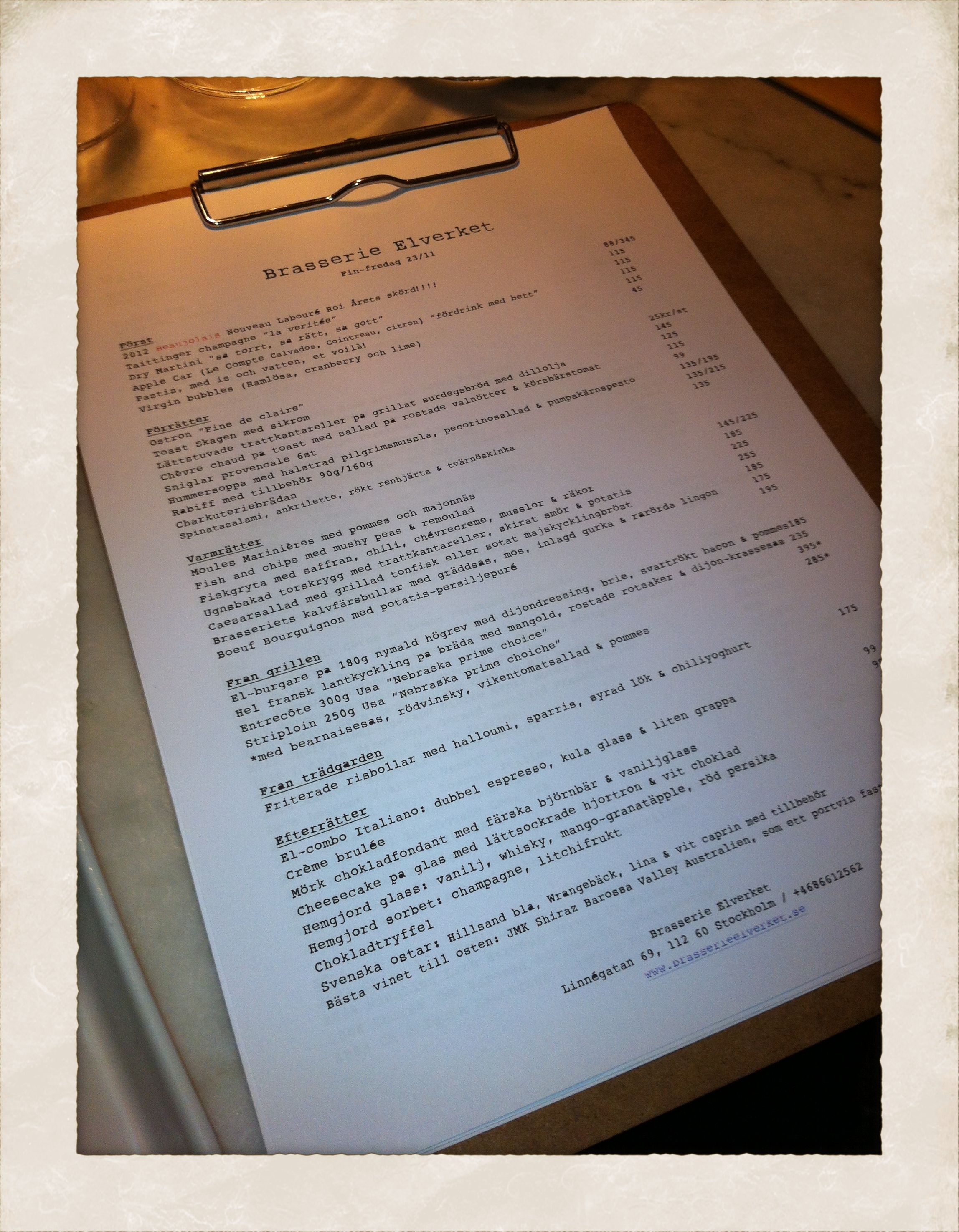Förr förra veckans jobbvecka avslutades på bästa sätt. AW middag med bästa sällskapet på Brasserie Elverket nära Karlaplan här i Stockholm. Vi åt och drack väldigt gott. Baren var fullsatt och i den lilla restaurangdelen var det stimmig men skön stämning med lite äldre klientel. Skönt att ha hyfsat nära hem dessutom. Vi kikar på några (I-Phone) bilder: