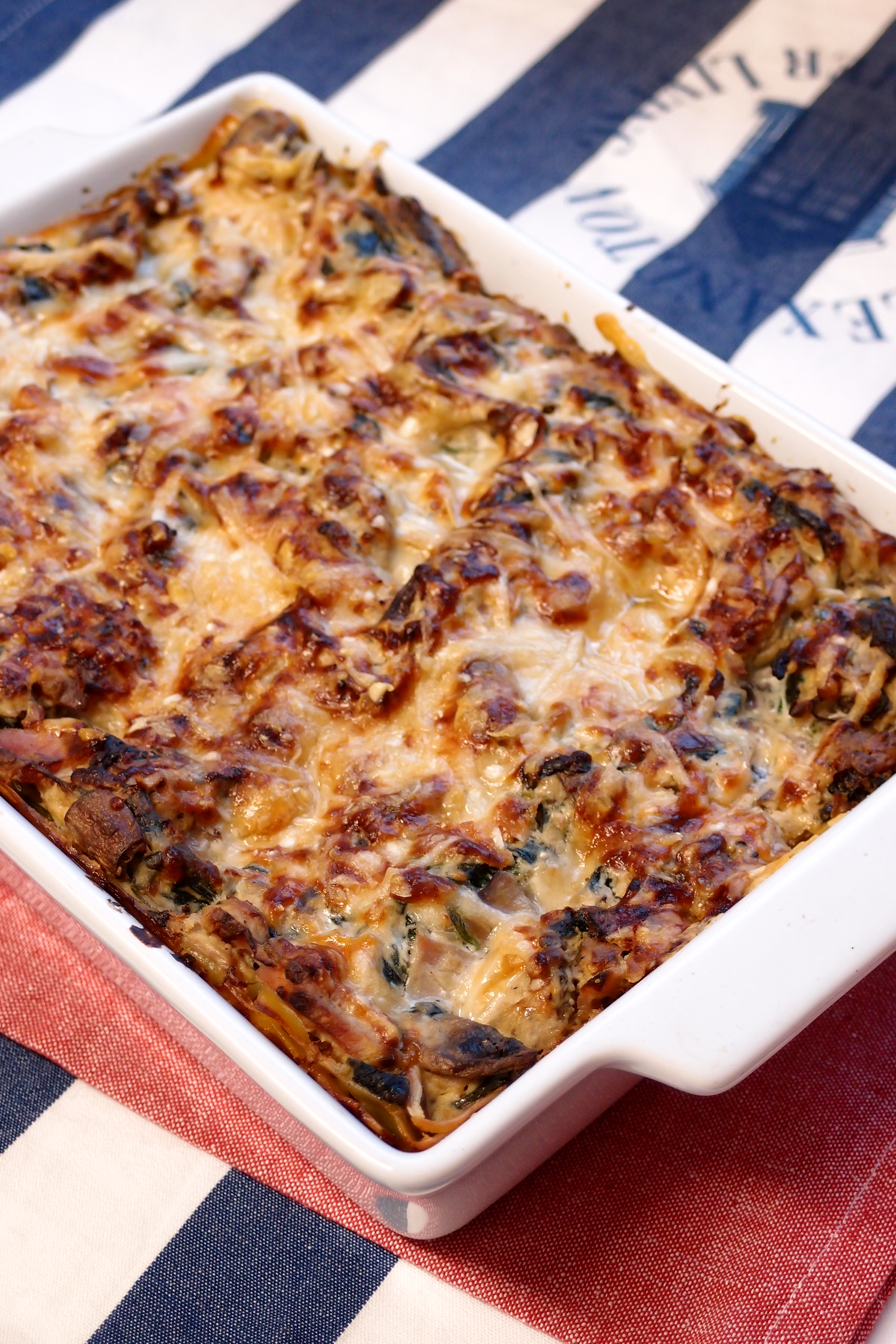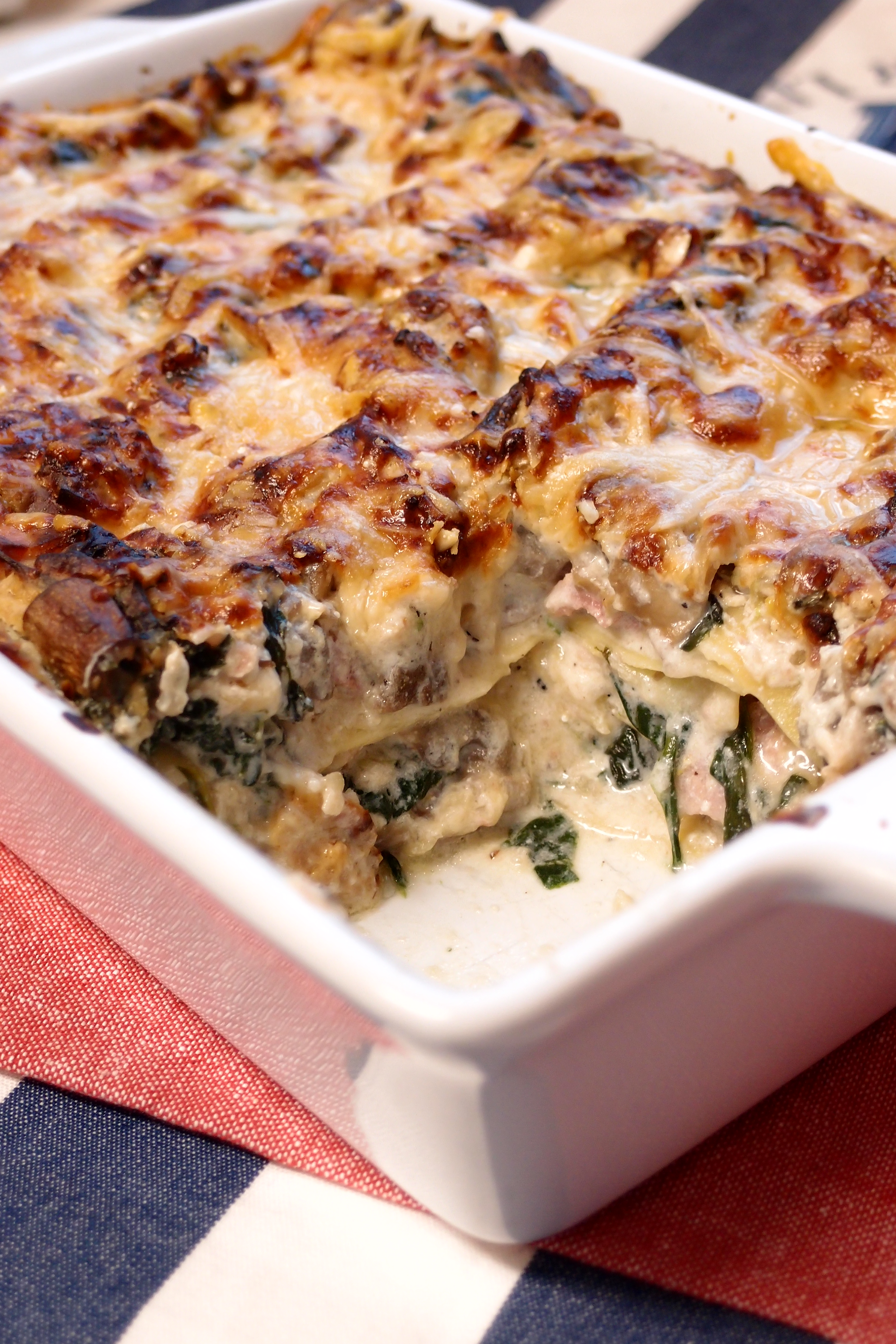 Det går utmärkt att göra rätten helt vegetarisk eller byta ut skinkan mot exempelvis knaperstekt bacon. Strunta inte i citronskalet, det ger hela rätten den rätta fräschören. Välj svamp efter eget tycke, egentligen var jag på jakt efter kantareller men det slutade med champinjoner i varukorgen och det funkade fint. Den här lasagnen är inte stark men smakrik på ett snällt sätt. Gillar du het mat så tillsätter du helt enkelt chili, tabasco eller sambal oelek.