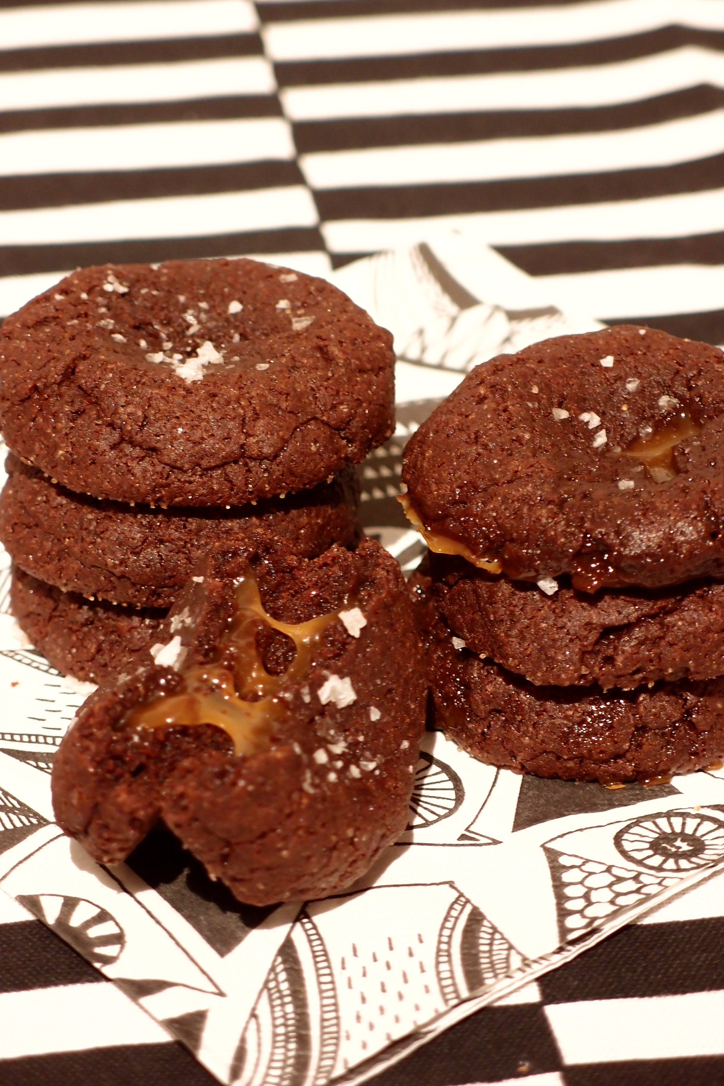 Smält försiktigt smör, socker, kakao, choklad, salt och vanilj över vattenbad eller i mikron. Låt svalna och blanda sedan ner ägget. Sikta ner mjölet blandat med bakpulvret. (Degen är flottig i konsistensen). Forma 12 bollar av ungefär 2/3 av degen, resten behövs som ett lock. Gör en fördjupning i varje boll och fyll med en klick (en tsk ungefär) kinuskisås. Platta ut lite deg och fäst som ett lock över kakorna. Toppa med flingsalt. Grädda kakorna i ca 8 minuter för en mjukseg kaka.