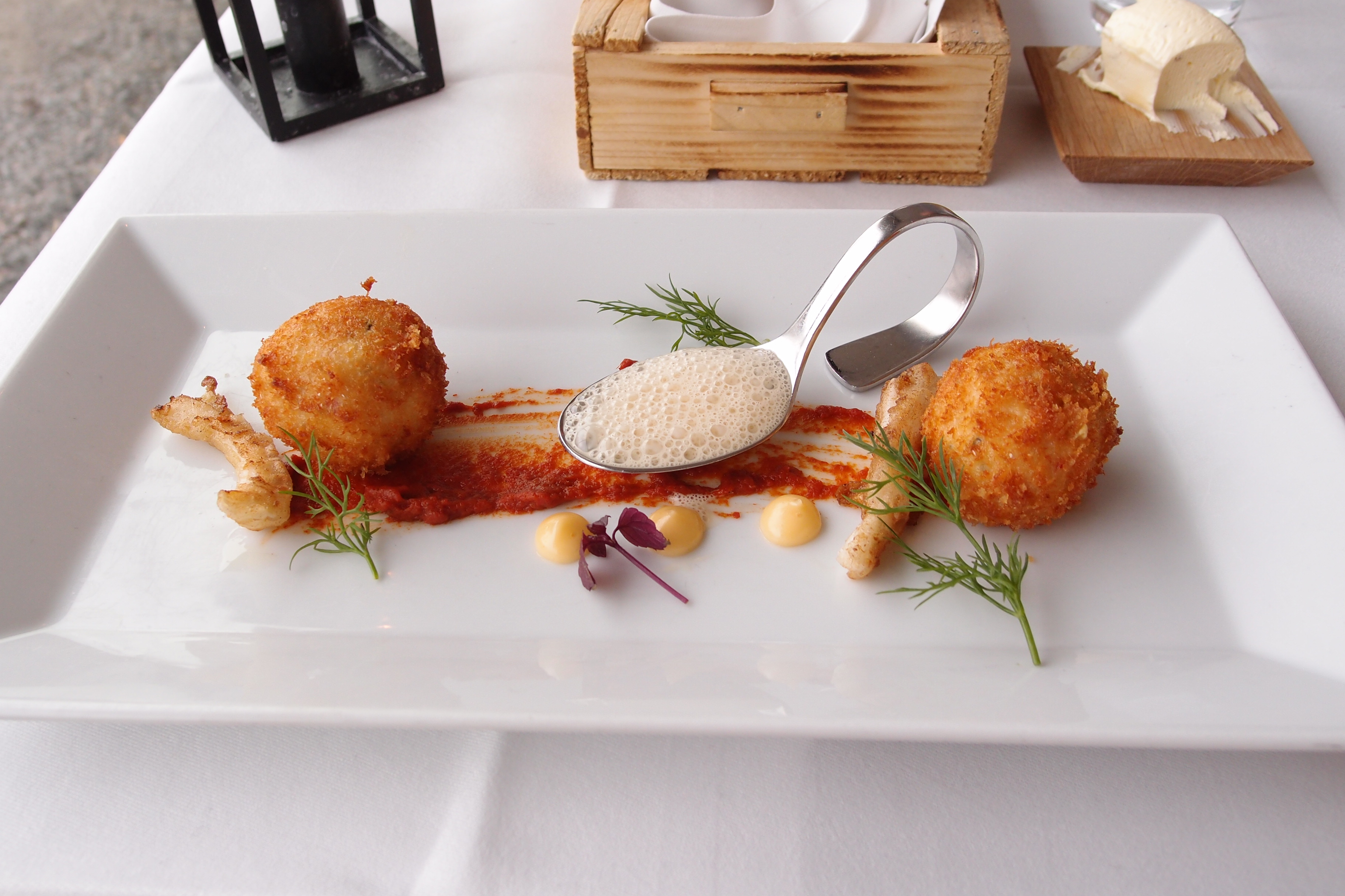 Övre bilden; Hummer- och torskcakes med svensk bläckfisk, rostad paprika samt kräftskum