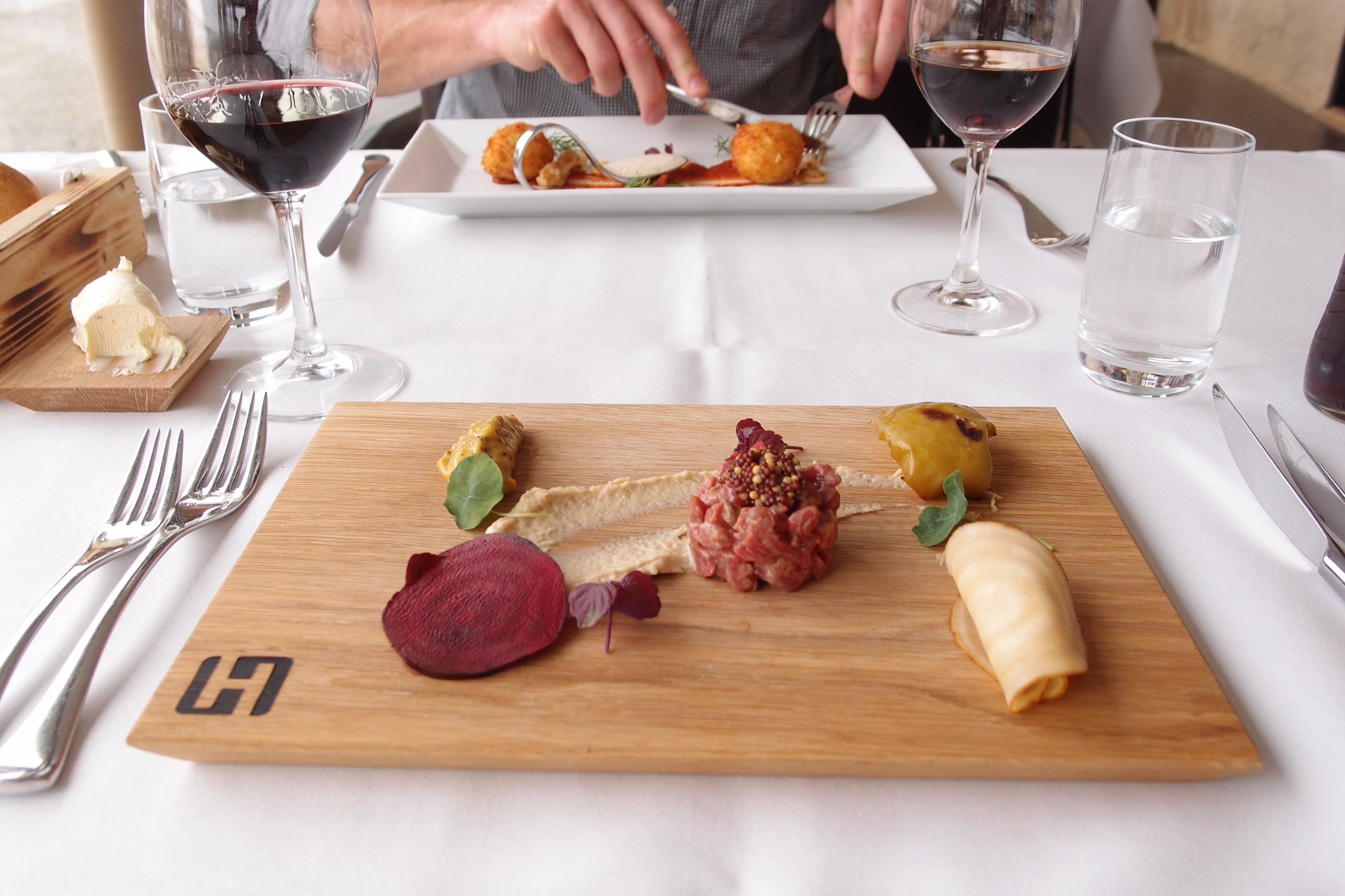 Undre bilden; Bifftartar från Grensholms herrgård med senap, picklade betor, äpple samt rostad schalottenlökspuré