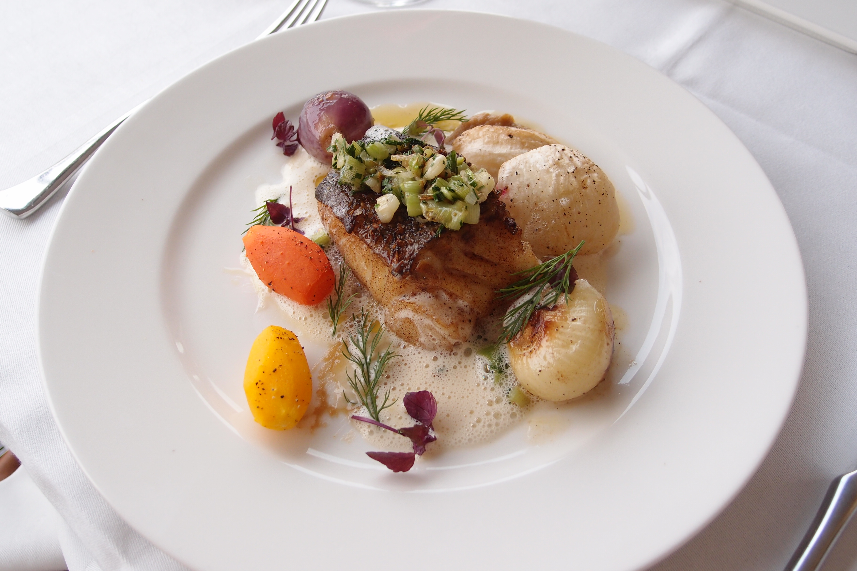 Bilden ovan; Krokfångad halstrad torskrygg med smörbakad majrova, pepparrotsskum samt variation på lök
