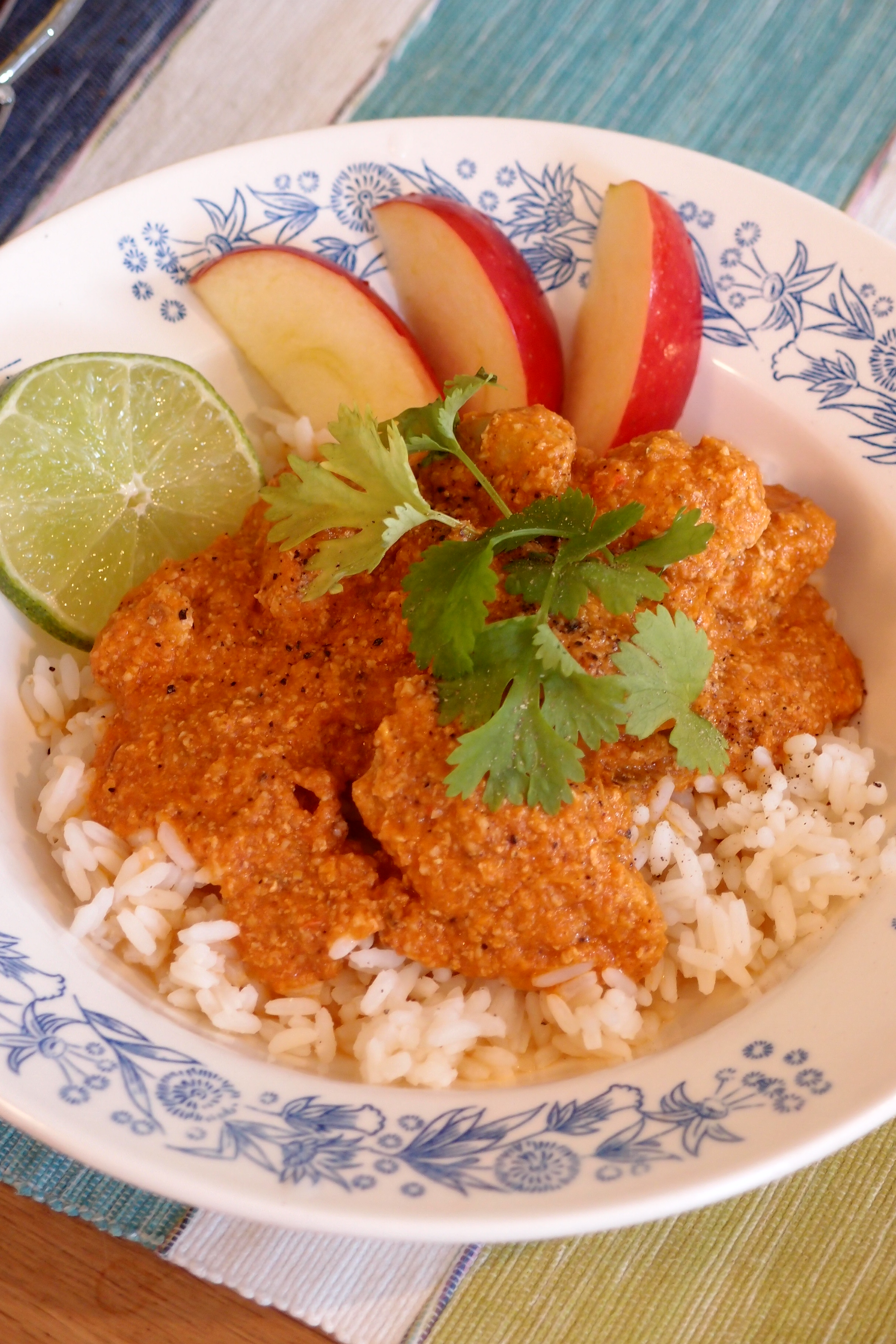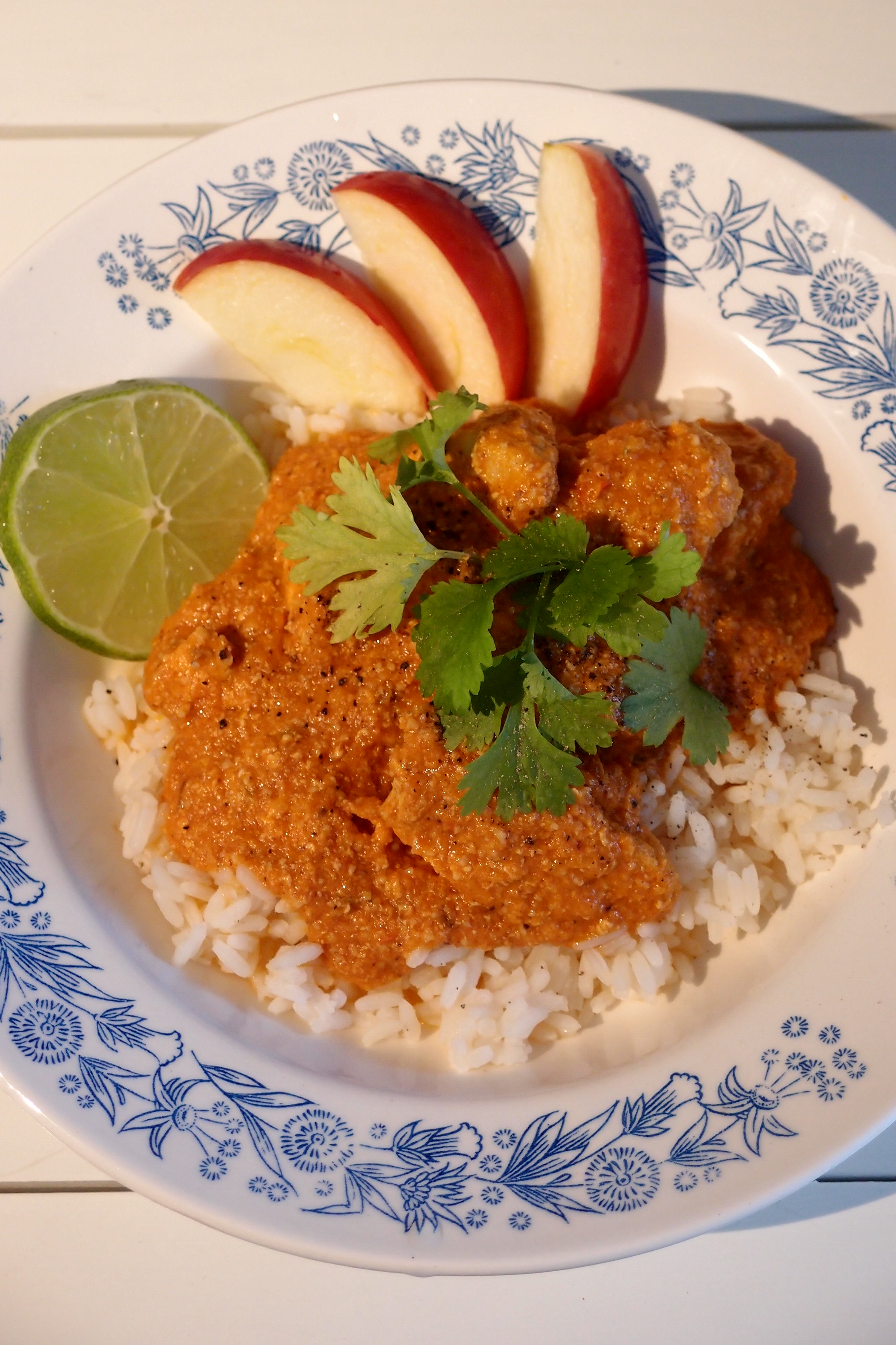 Det är verkligen gott med krispigt äpple och frisk lime till den här kryddiga och smakrika rätten. Raita – dvs naturell yoghurt med riven och urkramad gurka och salt är svalkande gott att servera till.