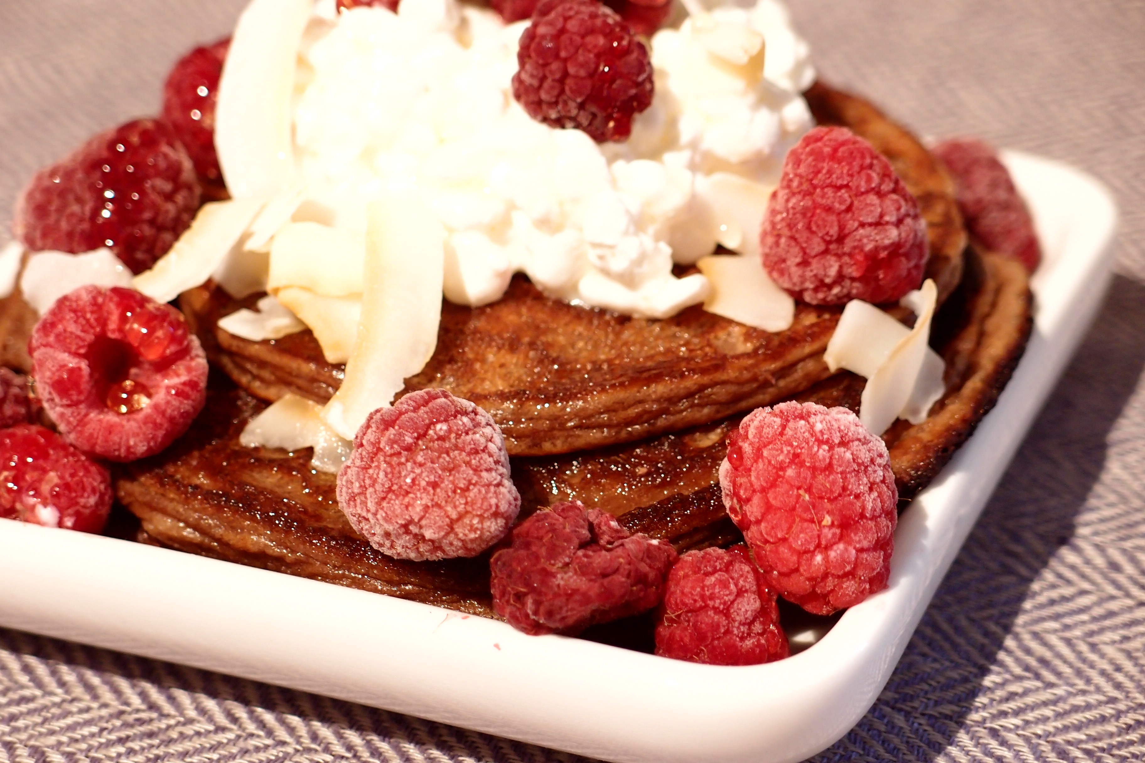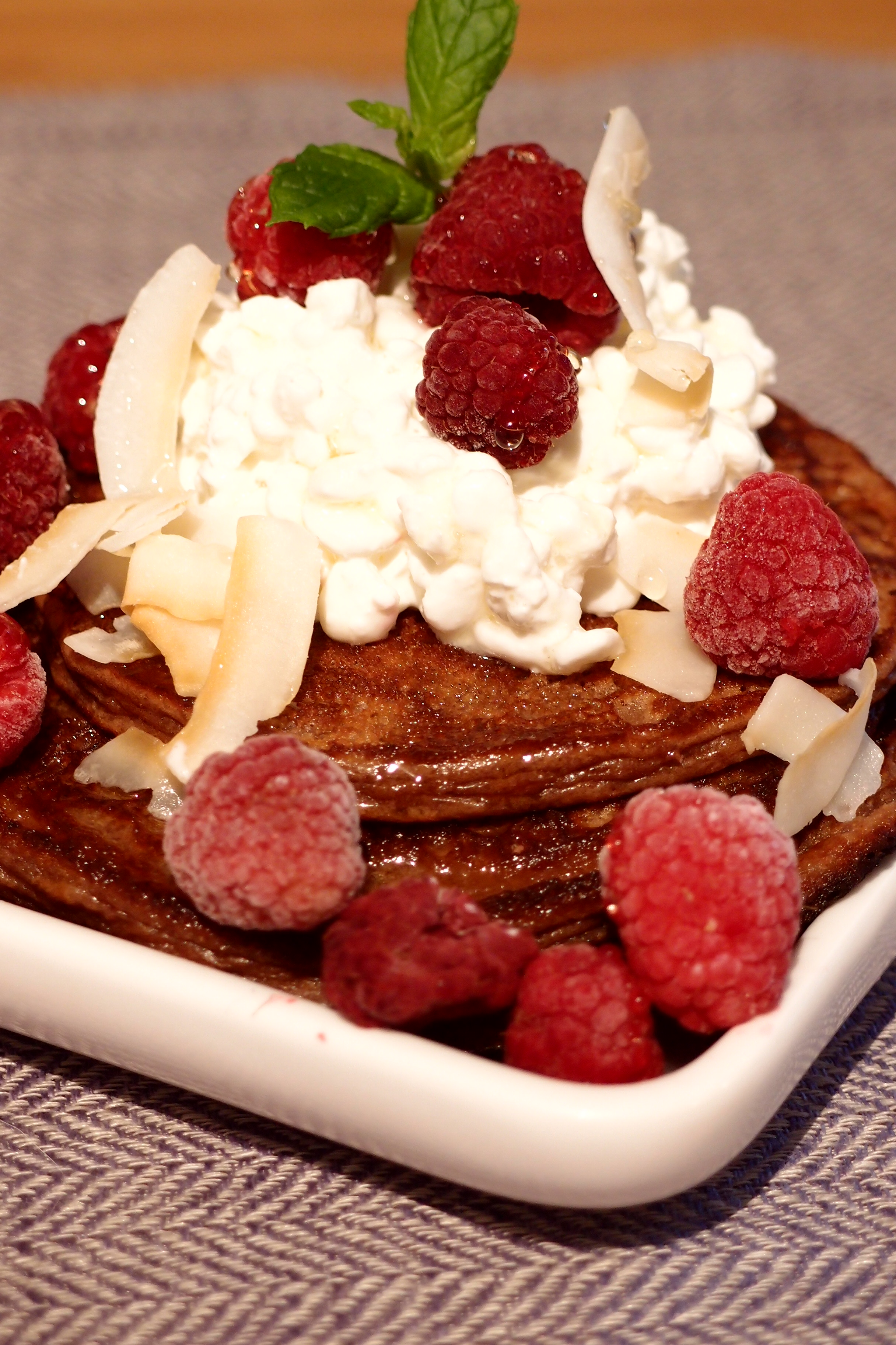 Just den här gången blev det dock keso, hallon, agave sirap och kokoschips på ett berg av proteinpannkakor med choklad- och banan smak.