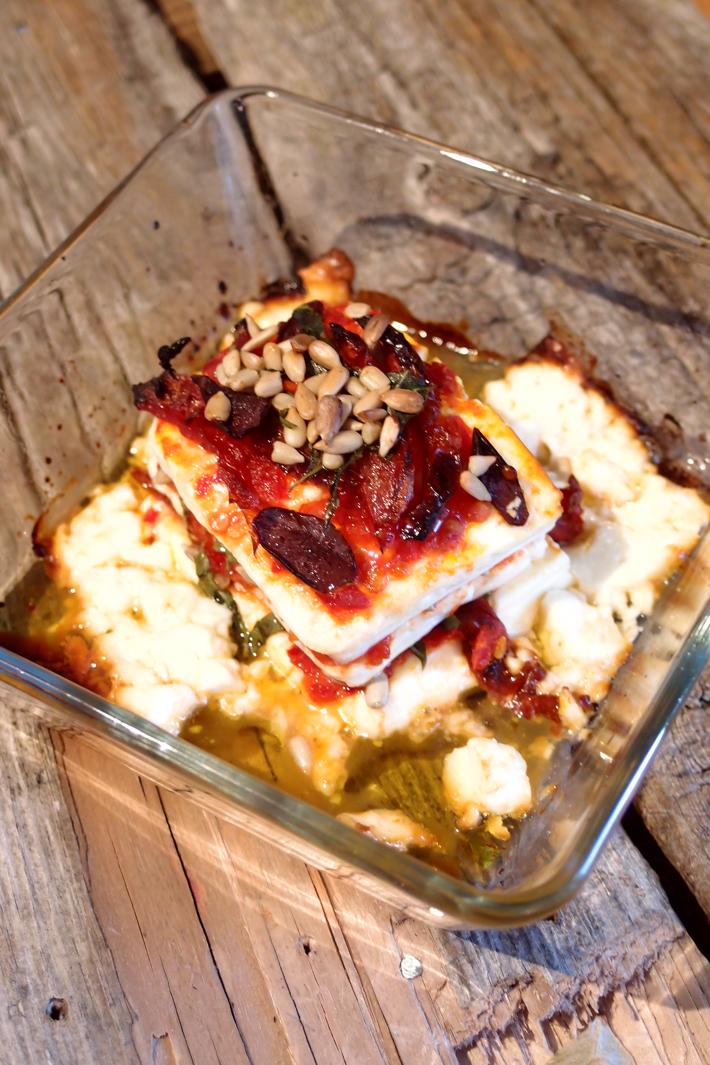 Ringla olivolja i botten av en ugnsform. Varva tunna fetaostskivor med generösa lager av sambal oelek, strimlad soltorkad tomat,  oliver, färsk basilika samt pinjenötter eller solrosfrön (för tuggmotstånd). Smula sista fetaostskivan runt om på sidorna – det är dessa bitar som blir knapriga och sega när de får lite färg. Toppa med flytande honung och skjutsa in i en varm ugn (225°) i ca 10-15 minuter. Prima tillbehör!