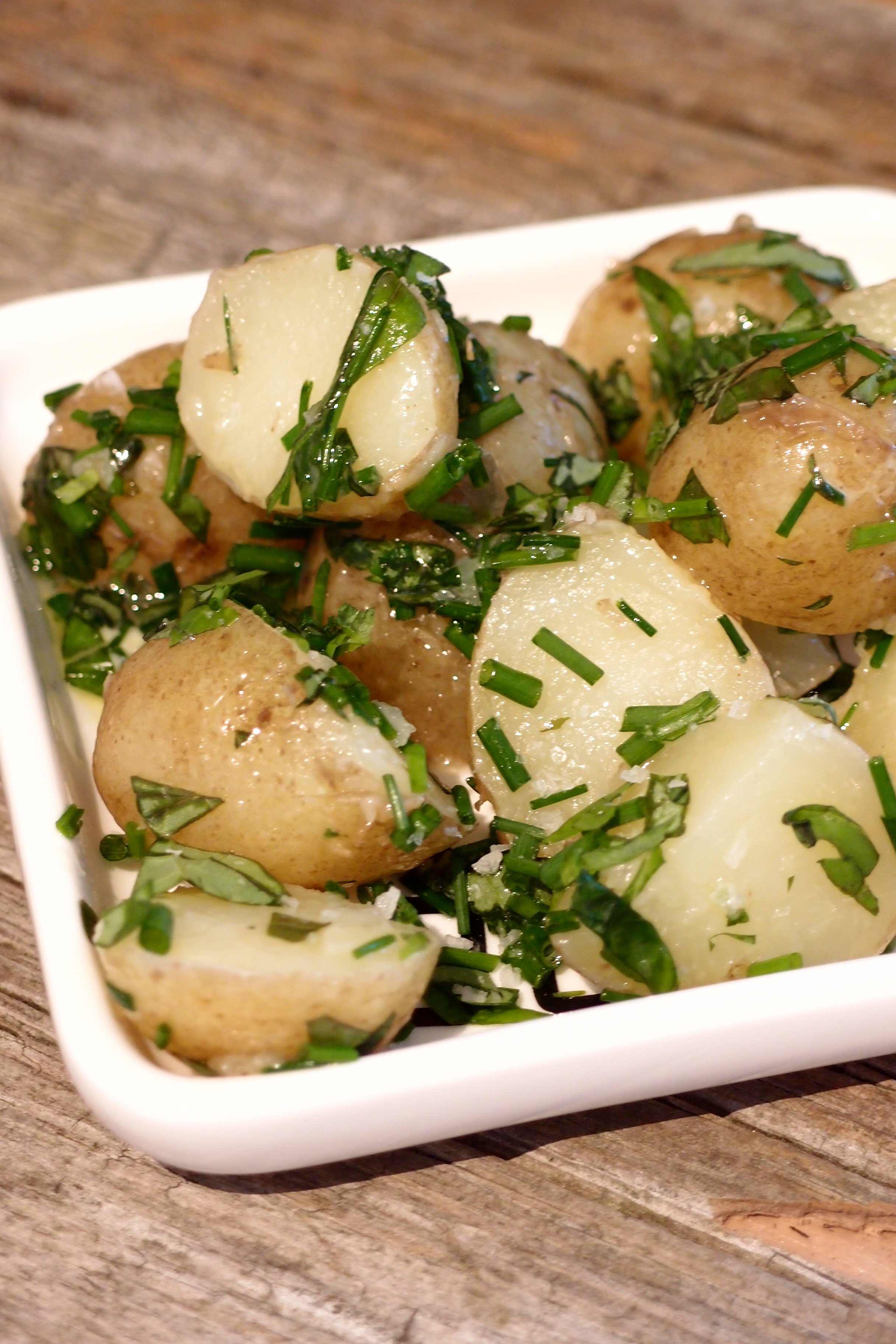 Nypotatis (som vi säger på Åland) eller färskpotatis är ju kanongott precis som det är men vänder man runt varm och halverad nypotatis i smör, flingsalt, klippt gräslök och färsk basilika så smakar det helt fantastiskt! Ett hett tips till midsommarbordet.