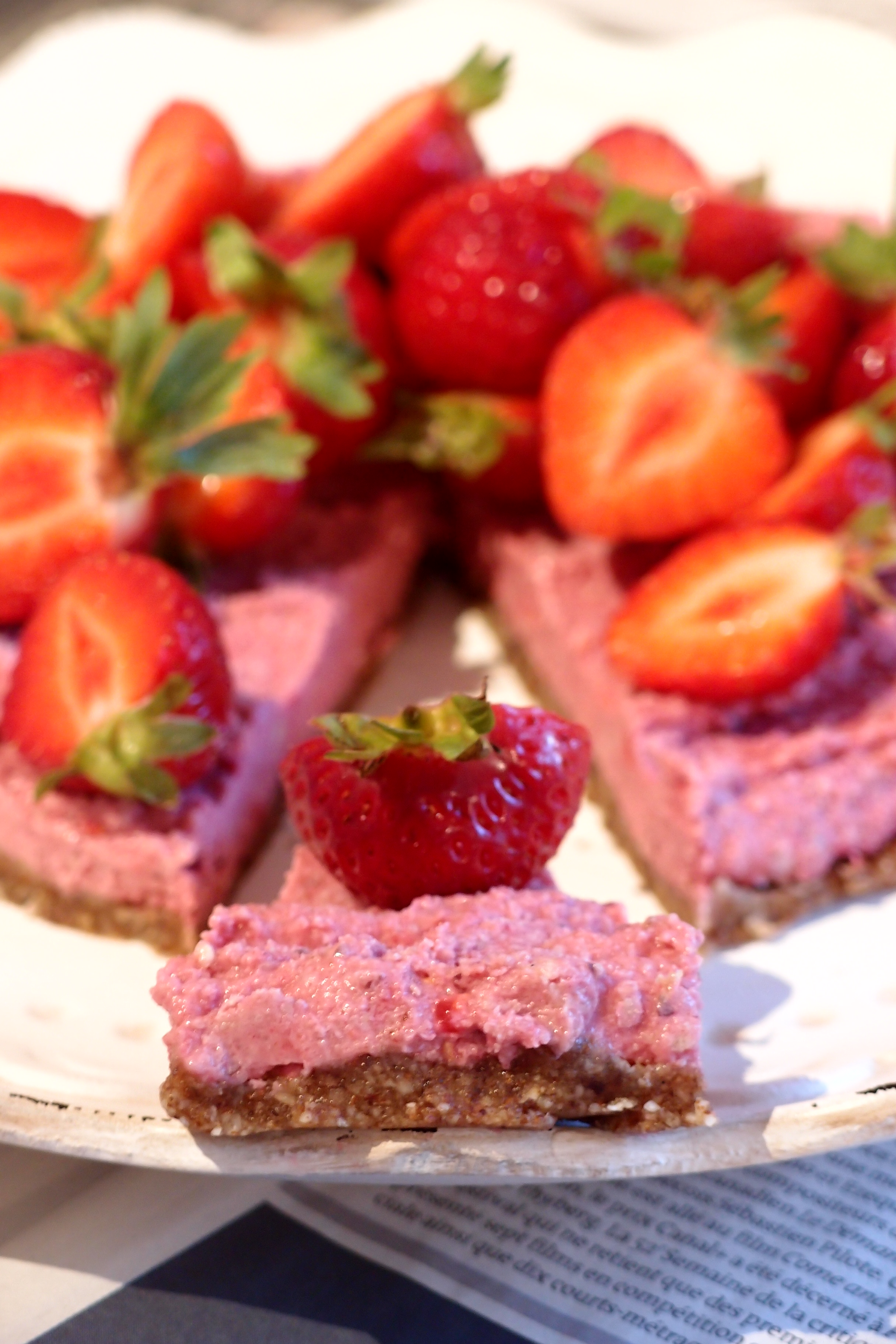 Den här skönheten är nästan raw, fri från sädesslag och vitt socker. Botten är söt och seg och fyllningen fräsch och halvfrusen med smak av hallon… ja ni fattar, det här är gott!! Kommer bli mitt svalkande kvälls-treat ett tag framöver, mmmm.
