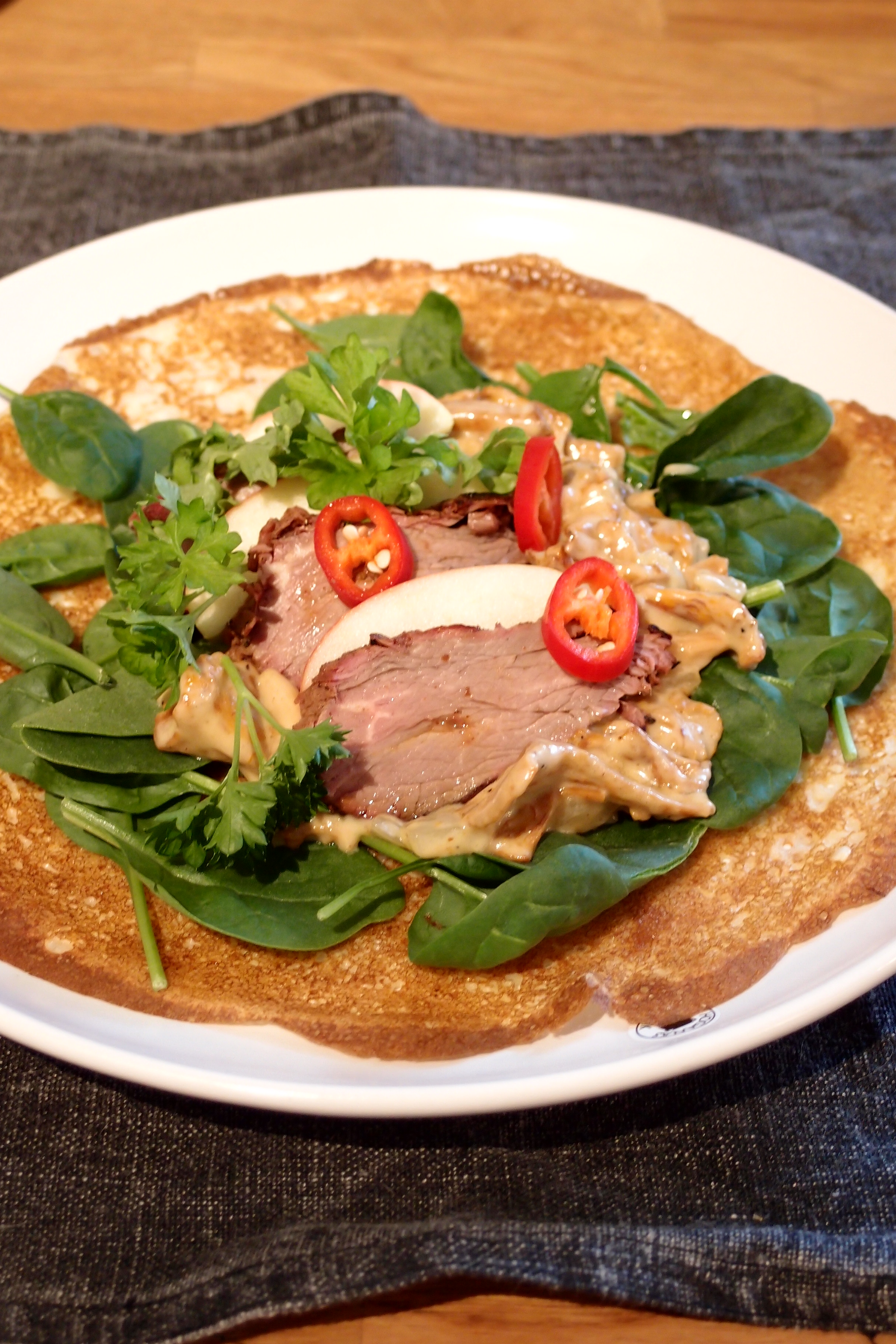 Hur som helst. Måndagens middag blev crêpes eller tunna plättar med kantarellstuvning och (resterna av marinerad och grillad) oxfilé. I botten färsk spenat och äppelskivor droppade med limejuice. Persilja och chili som topping. En klick fraîche eller grillsås är nog också gott till. Smarrigt värrre! Öppna crêpes blir dagens middagstips!