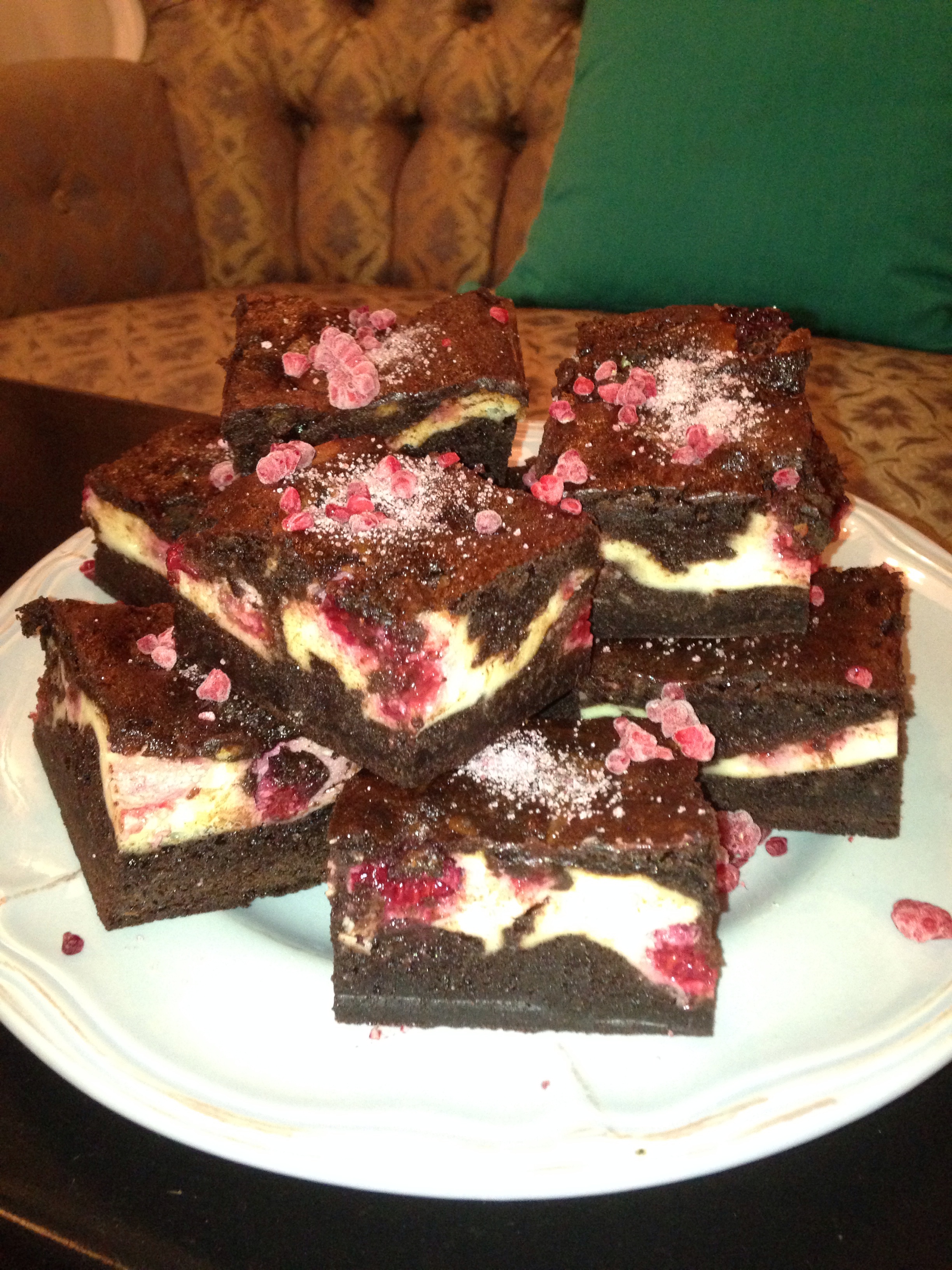 Dags för något riktigt gott; en blandning av godsakerna chokladig brownie, cheesecake och hallon. Grymt snygga och grymt goda!