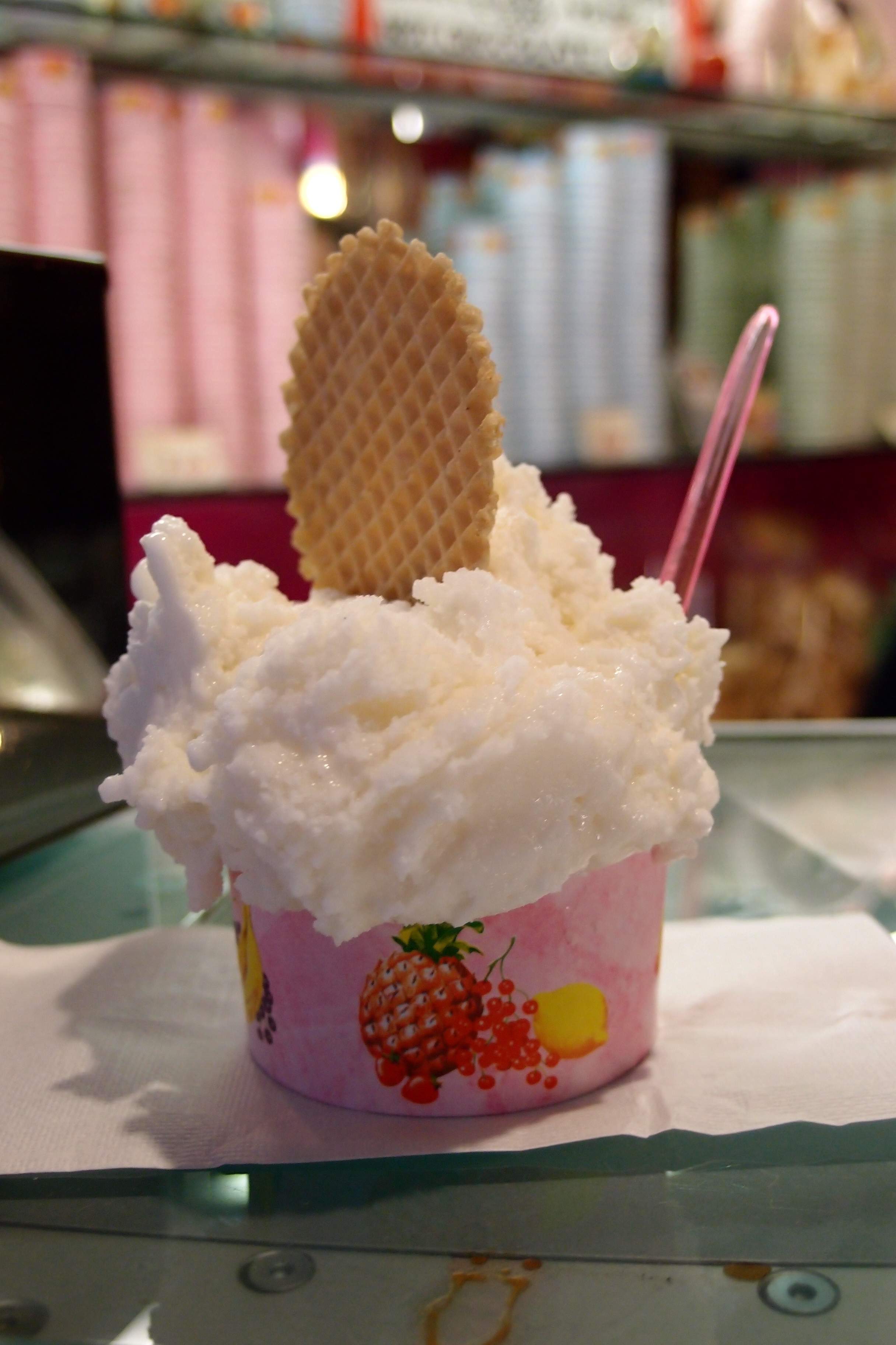 Gelato – alltså italiensk glass, fanns det verkligen överallt och den var mycket krämigare och lösare än vår gräddglass. Den kulades inte upp utan slevades snarare lite slarvigt ner i bägarna…. mycket gott var det iaf, slank ner ganska många portioner…. 🙂 Kokos blev min favoritsmak!