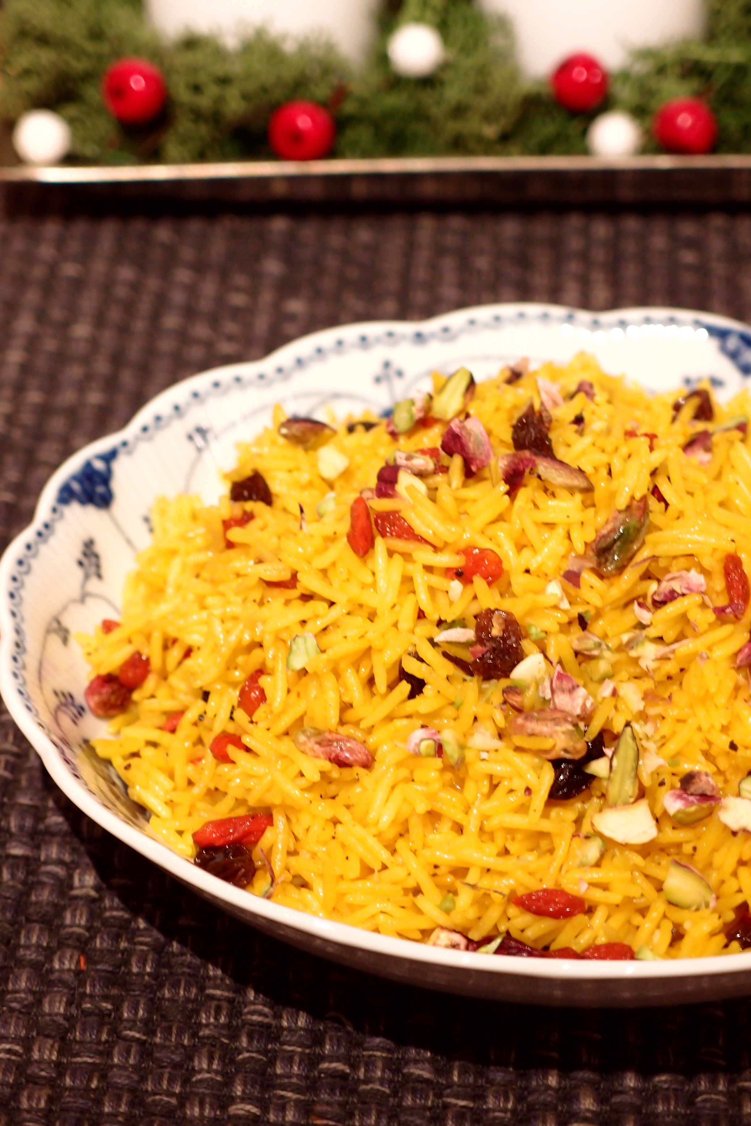 Smält en klick smör i en kastrull och tappa ner lite saffran (ca 0,25 g), en hel nejlika, en kanelstång, en remsa apelsinskal, lite kryddpeppar och kardemumma. Häll på vatten och salt enligt förpackningens anvisningar för basmatiris för 4 personer. Häll ner riset när vattnet kokar och tillaga under lock 10-12 minuter. Plocka upp de stora kryddorna. Salta ev mer och låt en klick smör smälta i riset. Toppa med nötter och torkad frukt (jag tog pistagenötter, gojibär och russin).