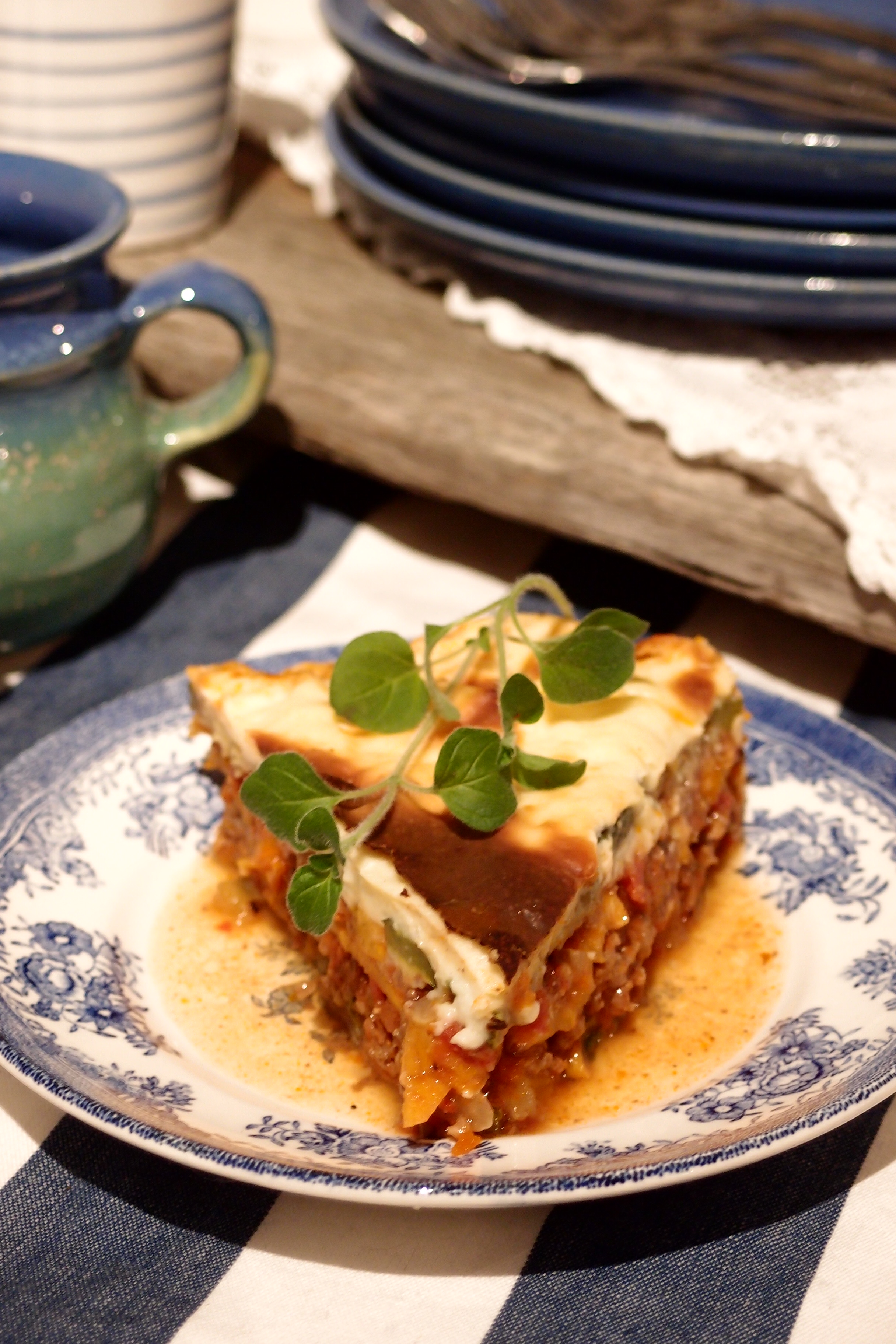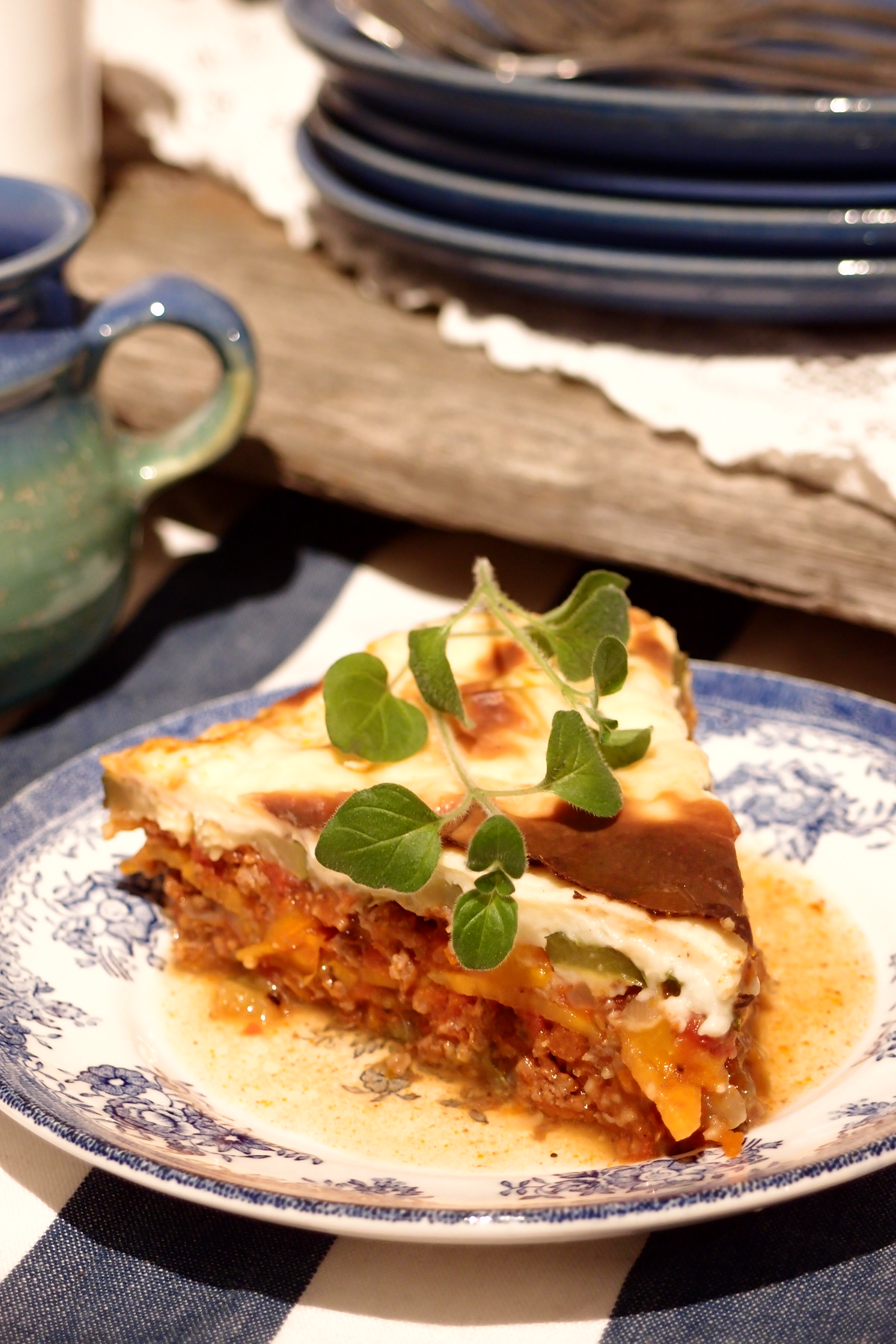 Färs kryddat med kanel, kryddpeppar och oregano varvas med stekt zucchini och skivad sötpotatis och toppas med ett lager bechamelsås. Resultatet blir en saftig och milt kryddig rätt som är god att servera som den är eller med bröd som suger upp den goda vätska som bildas i botten.