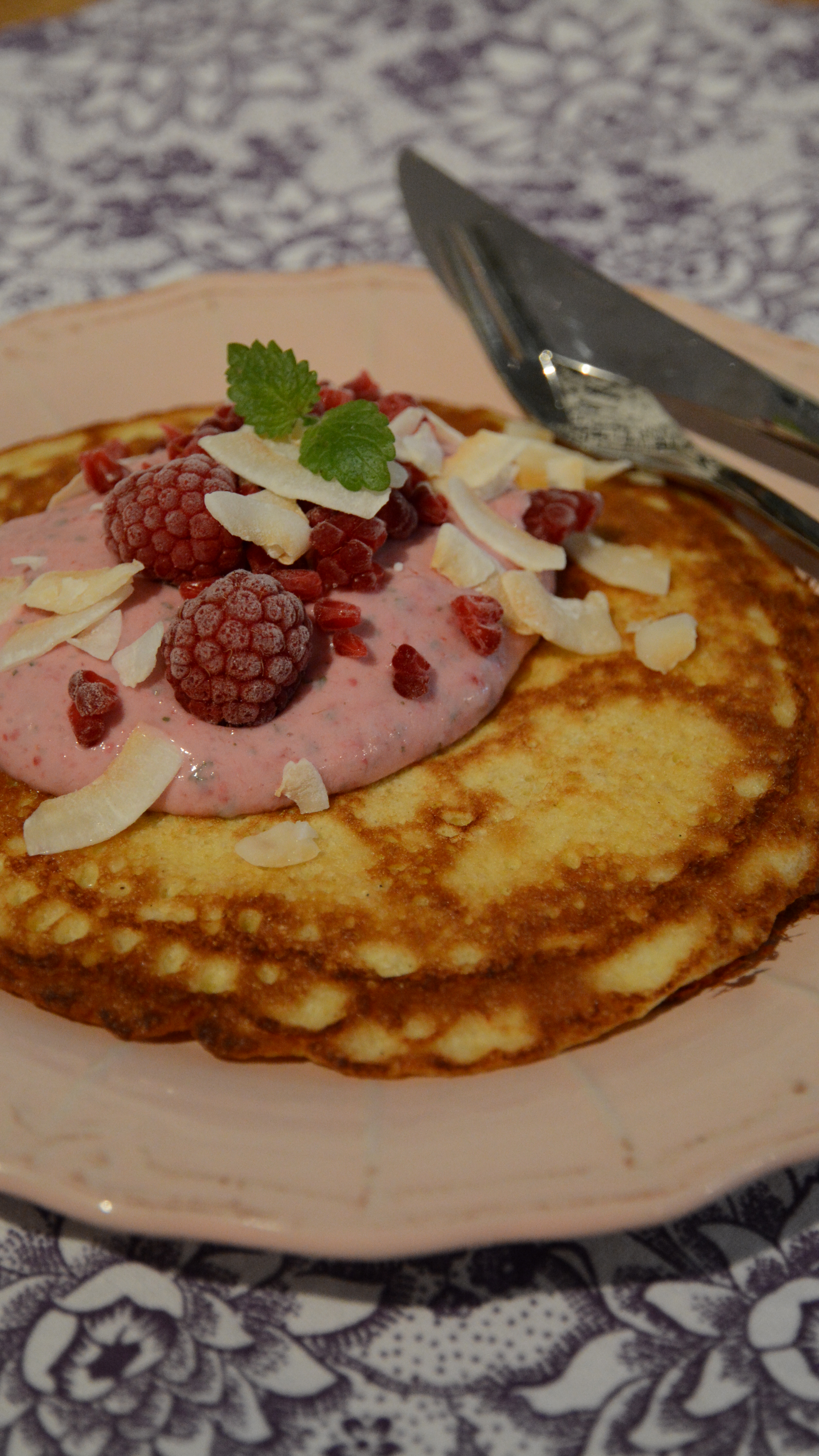 Mixa havregrynen till ett mjöl och mixa sedan ner ägg och kvarg och smaksättning. Stek en pannkaka i fett på medelvärme på båda sidorna.