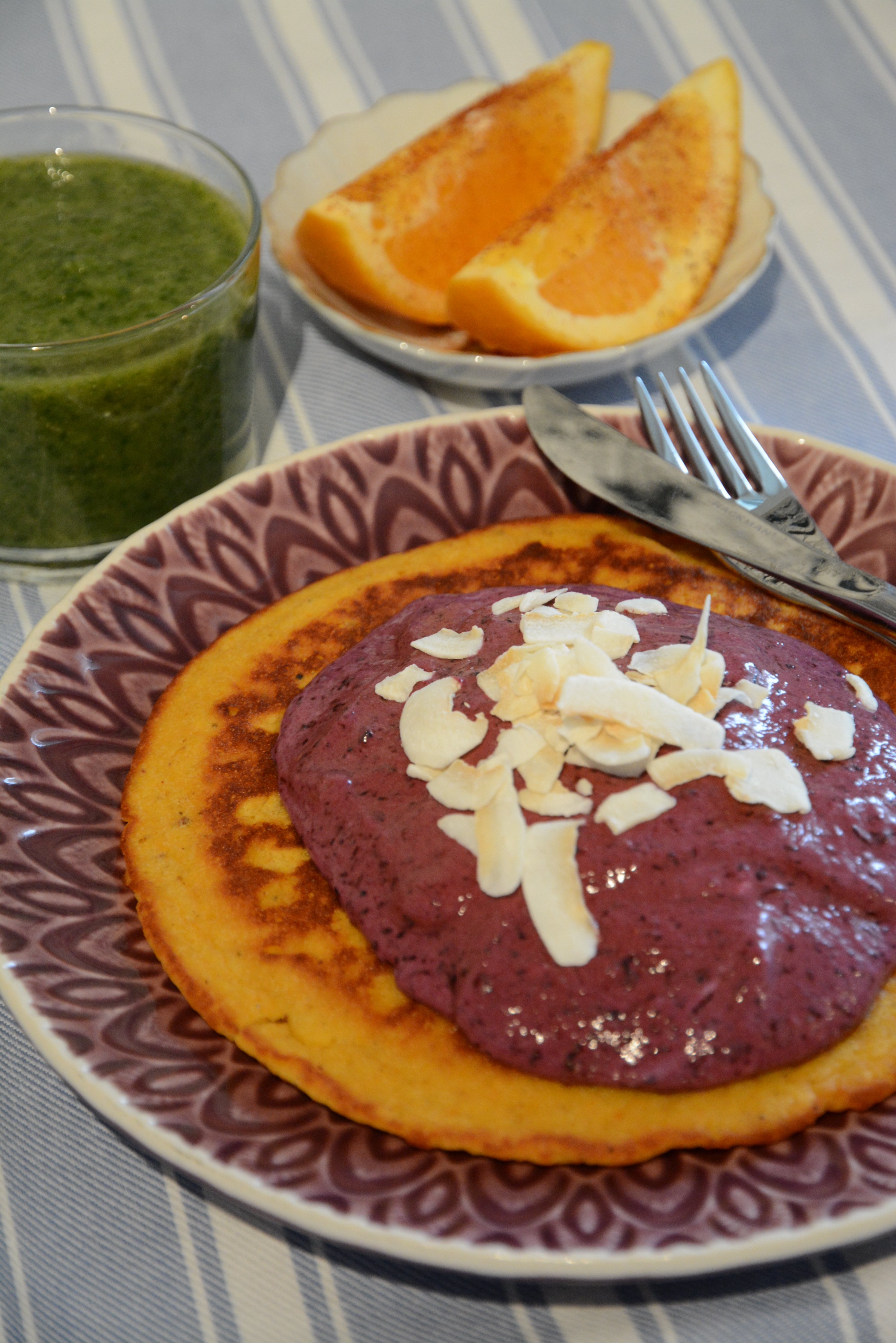Jag hade rester i form av ugnsostad sötpotatis kvar från en middag och bestämde mig för att mixa ner dem (sköljde dem först fria från salt och rosmarin) till en puré och testa dem i en pannkaka, ni vet – istället för banan i bananpannkakan. Blev väldigt lyckat och gott, så prova det!