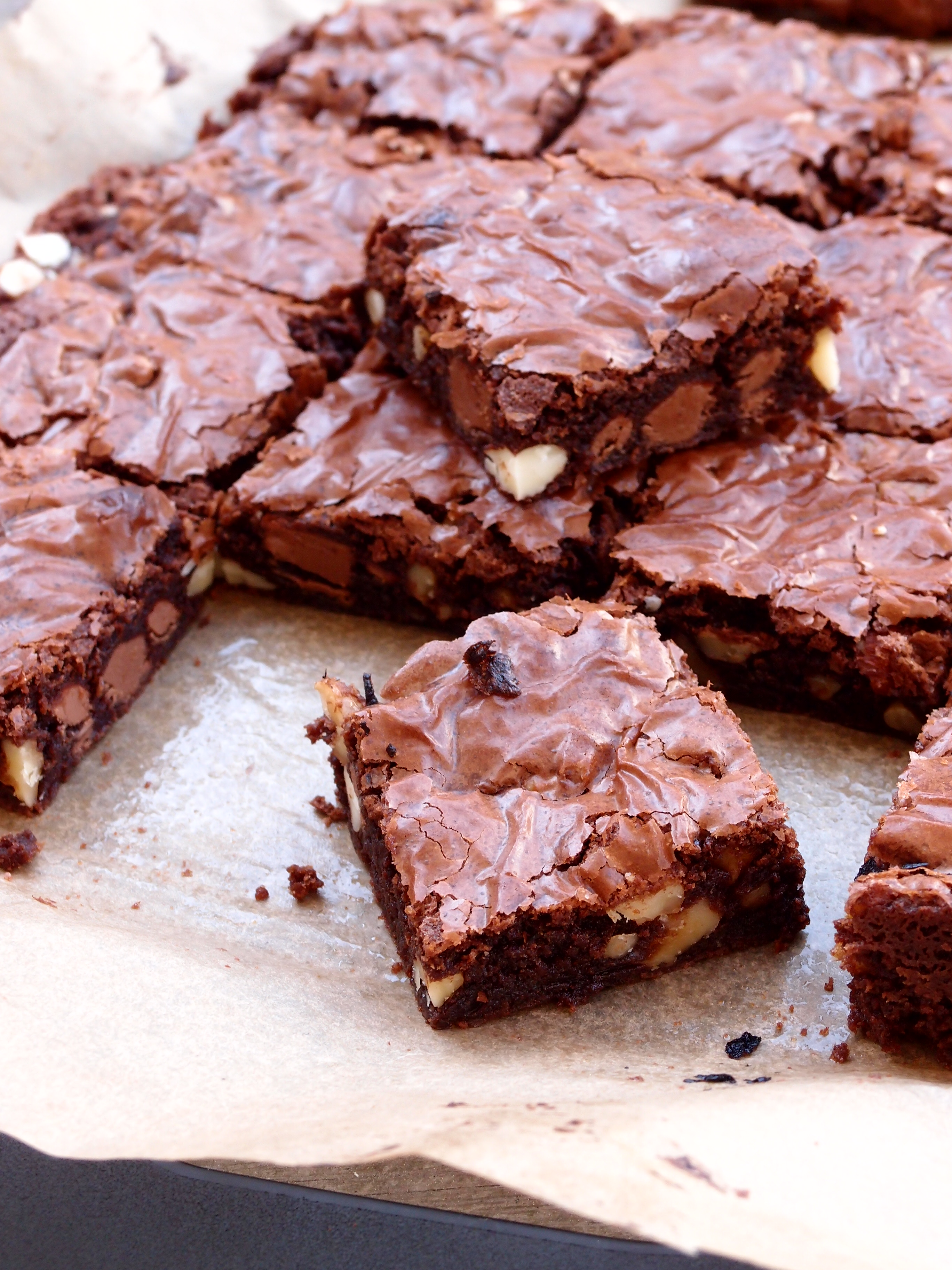 Smält 125 g hackad choklad över ett vattenbad. Vispa upp äggen. Rör ihop smör med strösocker, farinsocker, vaniljsocker och salt. Rör ner äggvispet lite i taget (så att ytan på kakan krackelerar och blir frasig). Blanda ner den smälta chokladen. Blanda mjöl och kakao och sikta ner det i smeten. Rör ner hackad choklad och nötter.