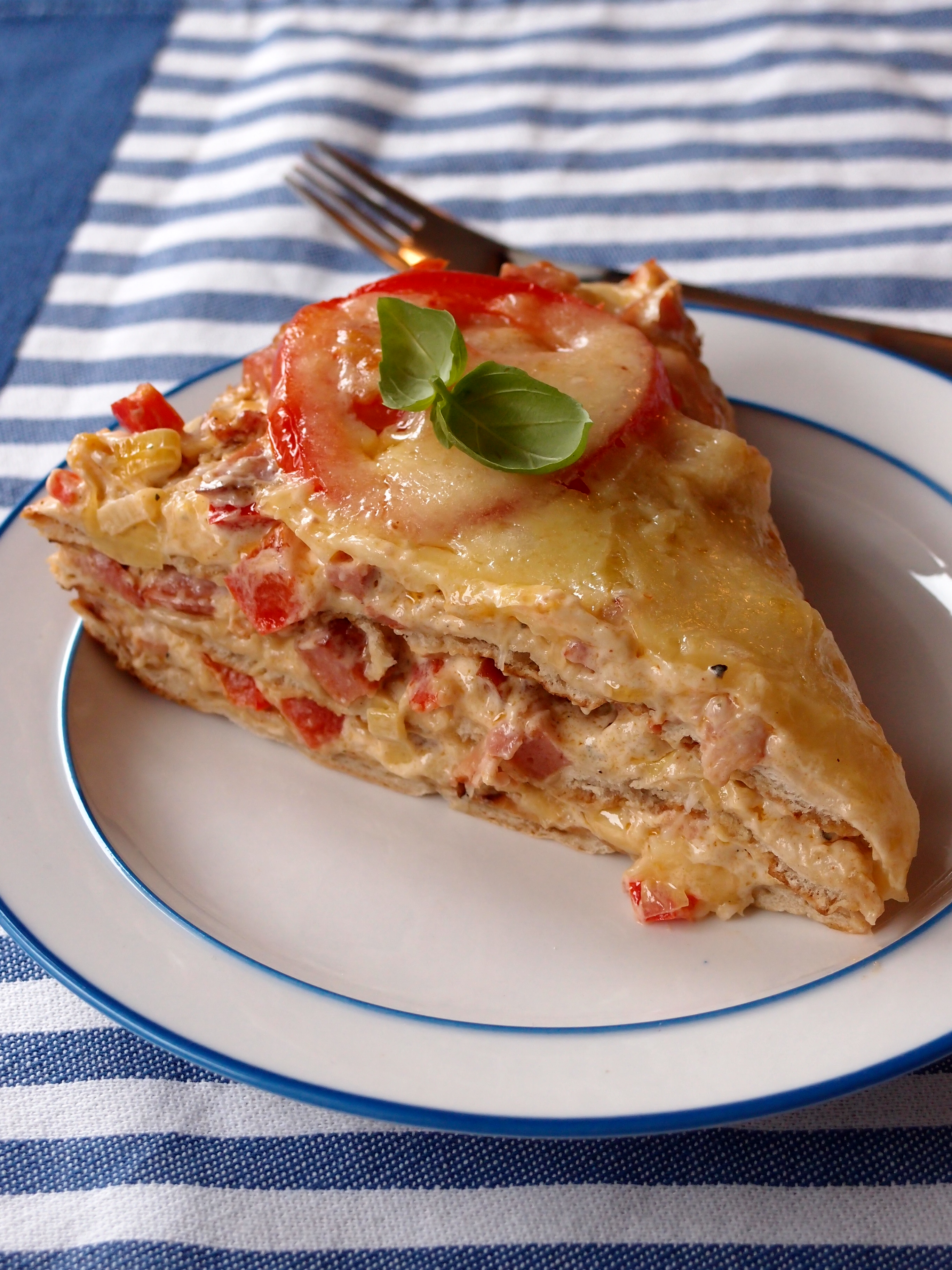 Röran mellan bröden får god smak av bacon, chirizo, paprika och purjolök. Crème fraîche och riven ost gör tårtan saftig och krämig.