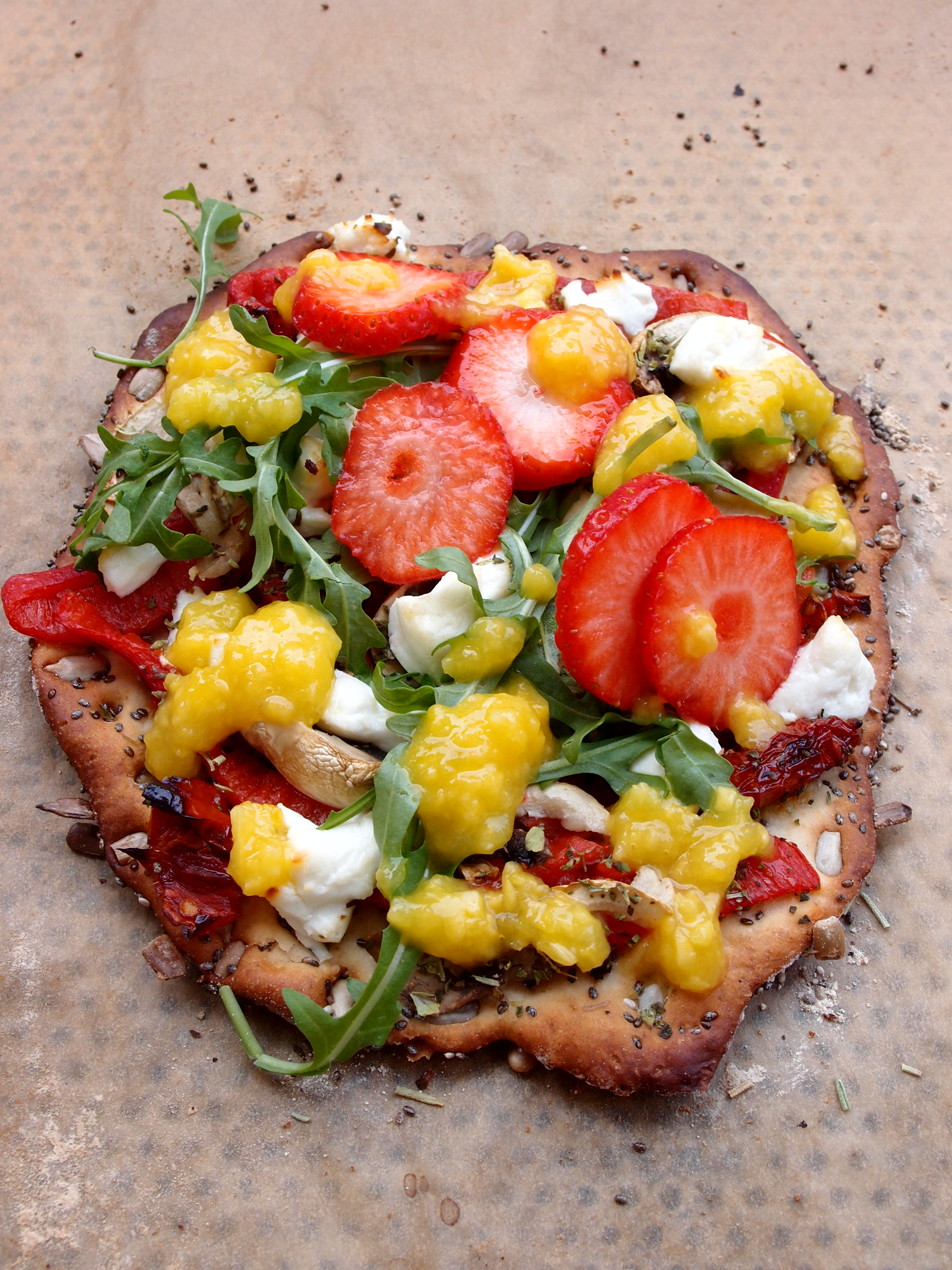Den här pizzan blev laddad med skivad champinjon, rosad paprika (från burk), hackade soltorkade tomater, krämig getost och efter gräddningen även ruccola, jordgubbar och mangosås. Saftigt och gott om smaker!