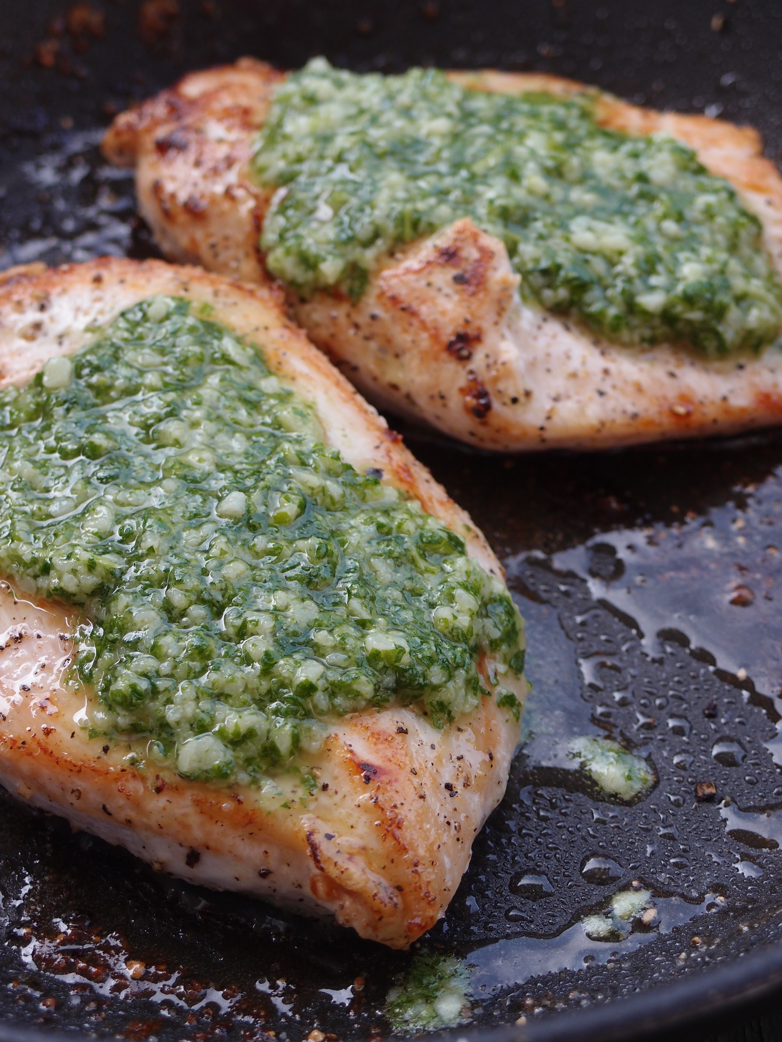 Mixa lite olja med färsk basilika, färsk kruspersilja, riven pekorinosot, salt, Dijon senap, honung och vit balsamvinäger. Det blir en god och fyllig olja – inte helt olik en pesto – som du enkelt häller över din nystekta kycklingfilé (som är saltad och pepprad).
