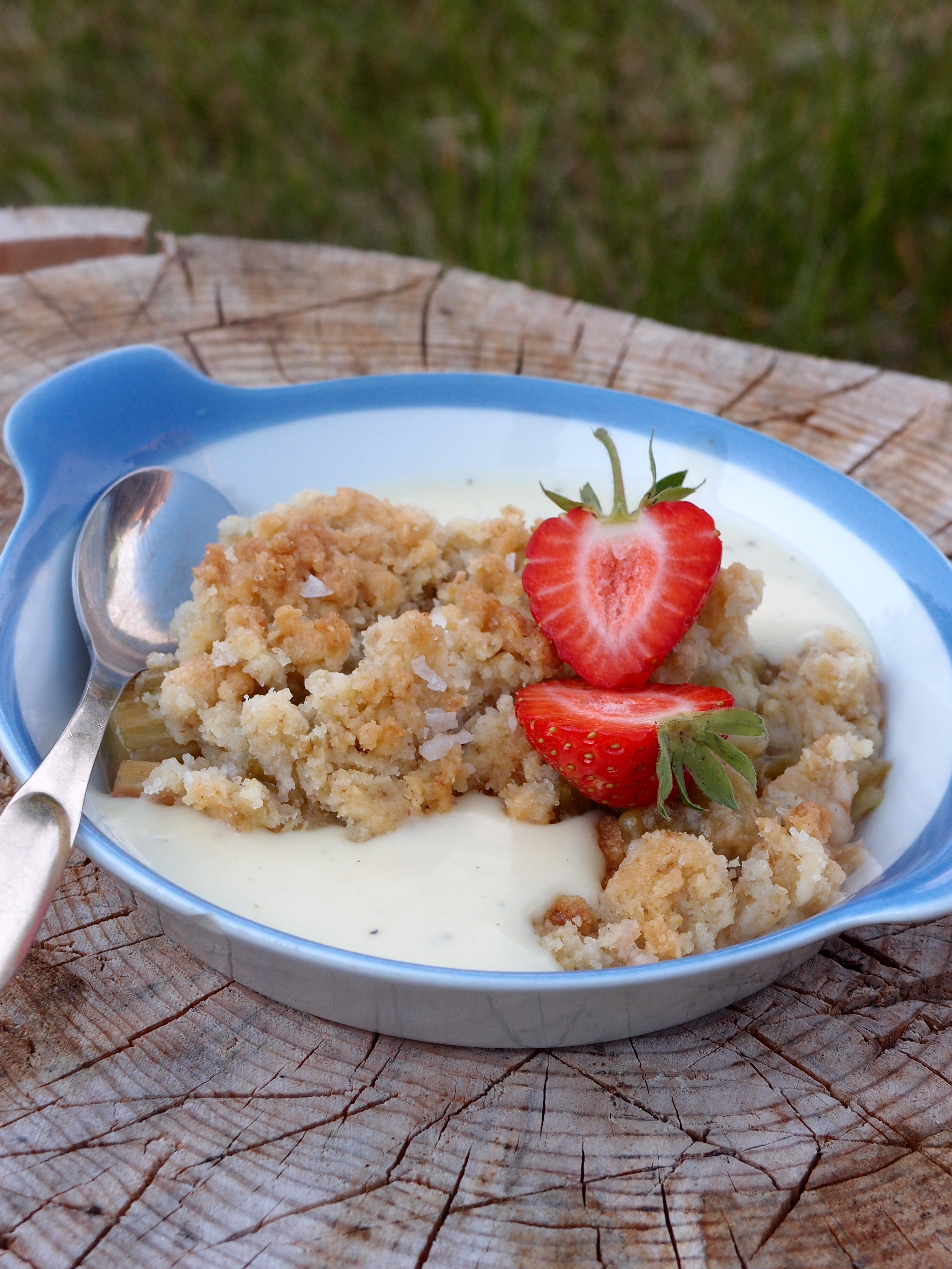 En busenkel klassiker är aldrig fel med vaniljsås eller vaniljglass. Jag lät den här vara fri från kryddor men i vanlig ordning är det gott att smaksätta smulorna med kanel eller kardemumma. Smulorna blir frasiga i konsistensen. Flingsalt ger smuldegen en fin smakbrytning.