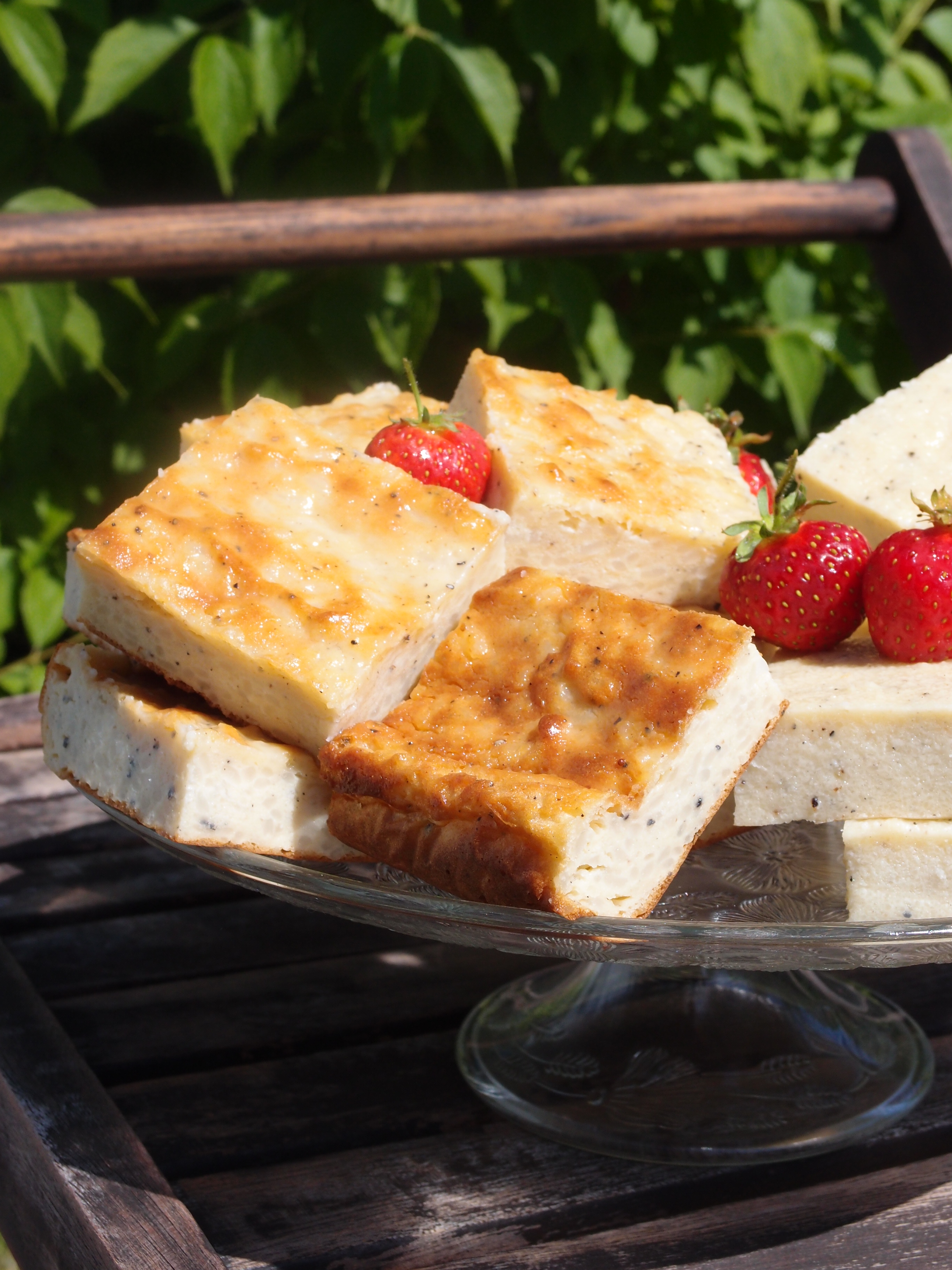Man kan alltså göra den både på mannagrynsgröt och tomtegröt och jag bestämde mig för att jämföra de två alternativen (gräddade dem samtidigt så som på bilden ovan) och bjöd över ett gäng vänner för fika i solen. Mannagrynsvarianten fick ingen färg alls i ugnen – vilket den brukar få. Men lika god var den för det!