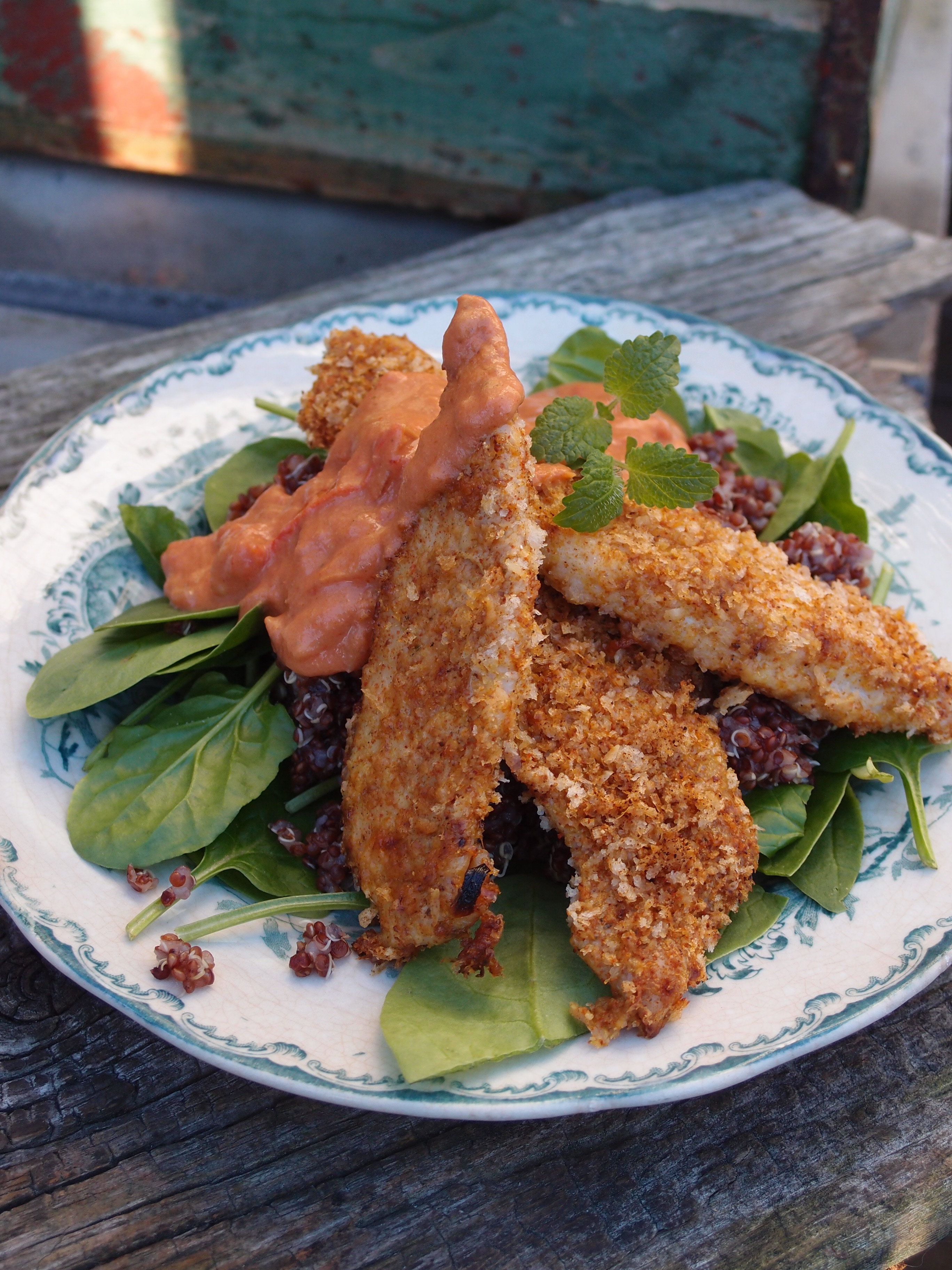 Panerad kyckling kanske klingar som en fet rätt i dina öron – men den här görs helt utan vare sig smör eller olja. Kör bara in den i ugnen. Ut kommer en saftig kyckling med fin färg och god smak. Vill du ha den där smörigt knapriga ytan är det bara att steka filéern gyllenbruna i smör/olja.