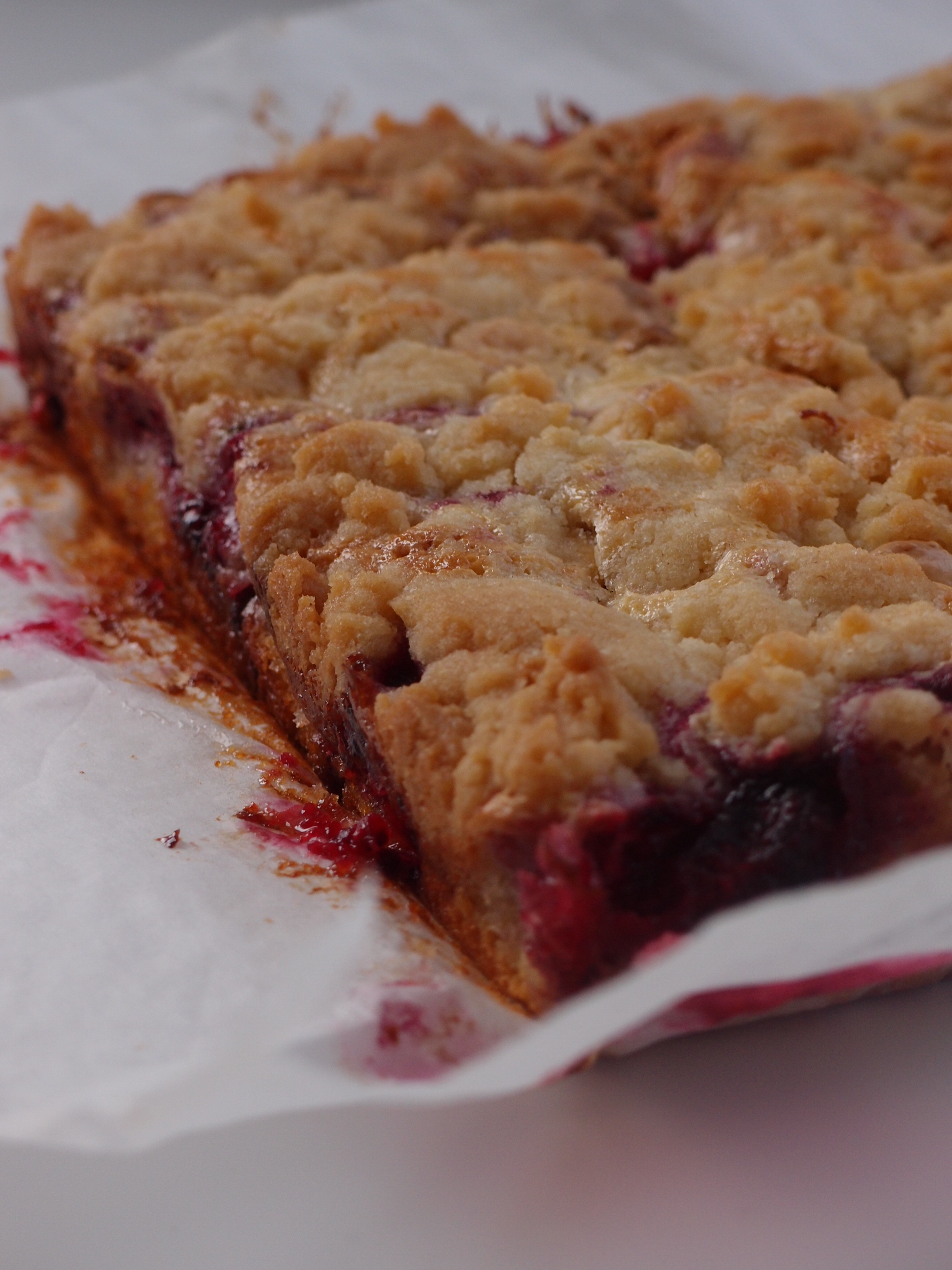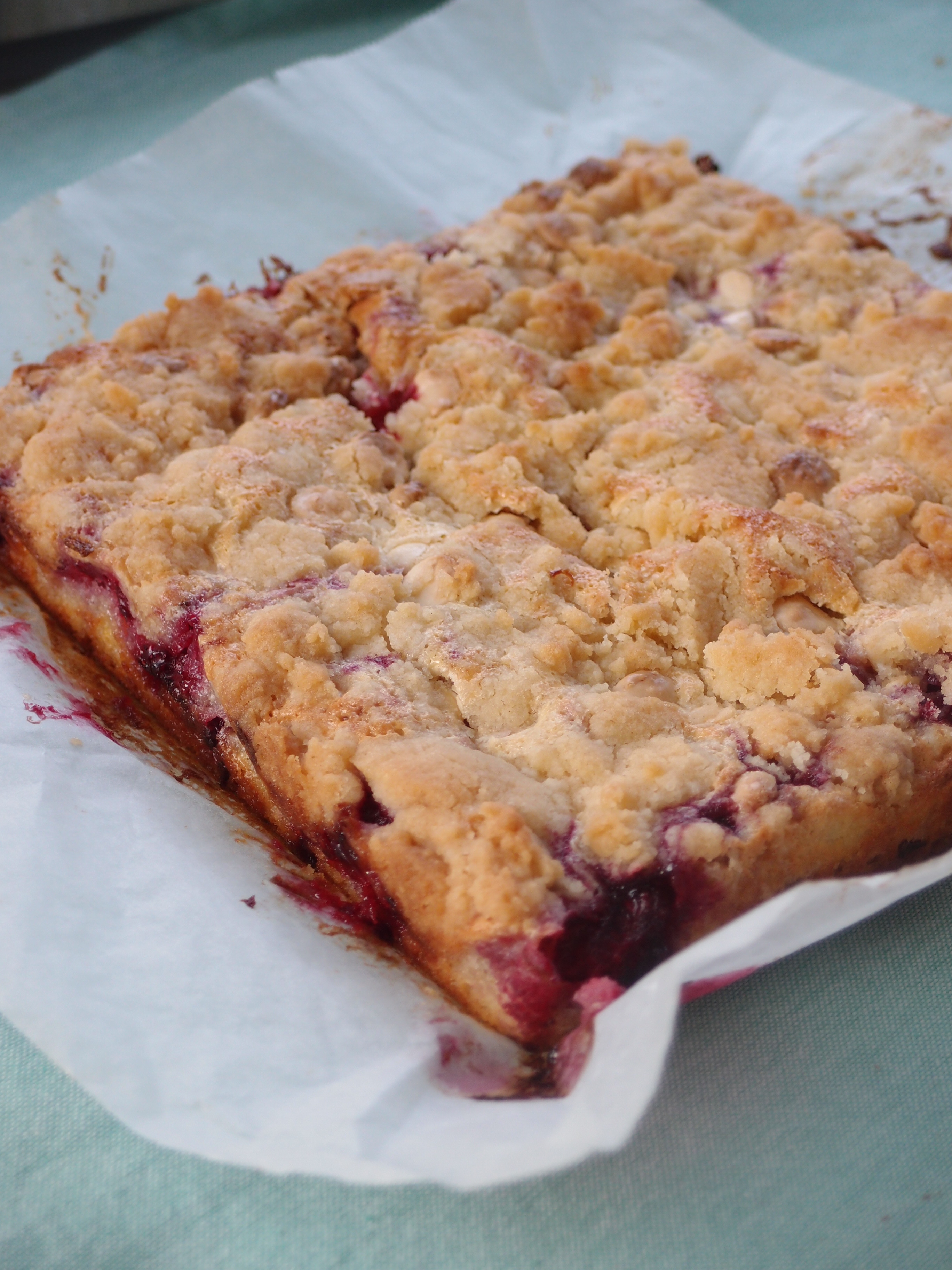 Rutorna kan beskrivas som en blandning mellan sockerkaka och paj med ett mjukt, saftigt innanmäte och en frasig pajliknande yta. Hallon, citron och vit choklad är en grym kombination! Om du som jag vill göra en liten, lite plattare kaka, halvera receptet och använd en form som mäter ca 19 x 19 cm och grädda i ca 25 minuter.