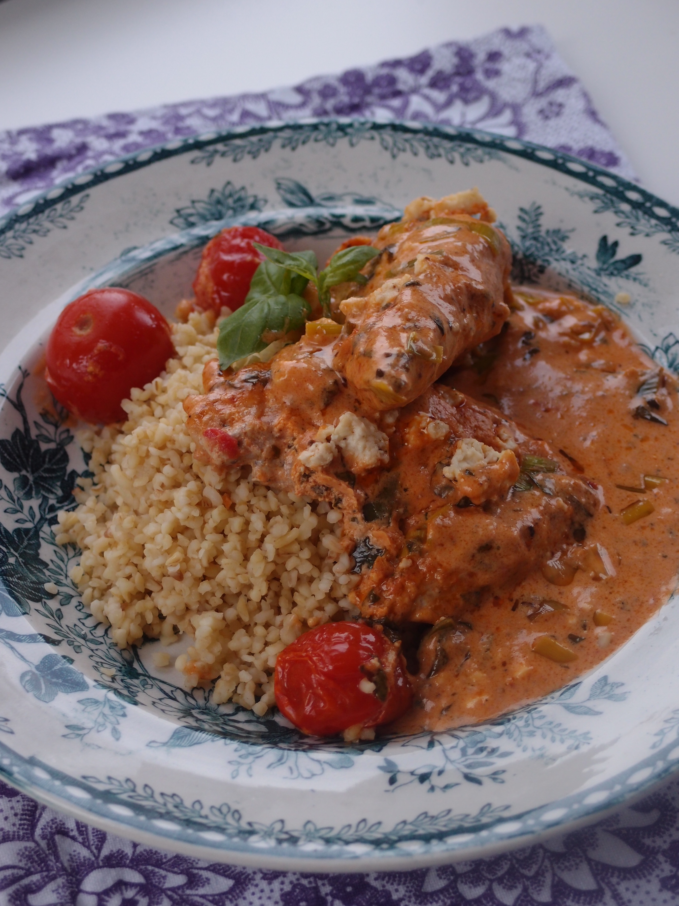 Sätt ugnen på 175°. Fräs på strimlad purjolök och vitlök några minuter i smör/olja, häll över i en ugnsform. Skär ev kycklingfiléerna på längden så de blir tunnare och mindre. Bryn dem hastigt på båda sidor i smör/olja, salta och peppra. Lägg över i formen tillsammans med tomaterna.