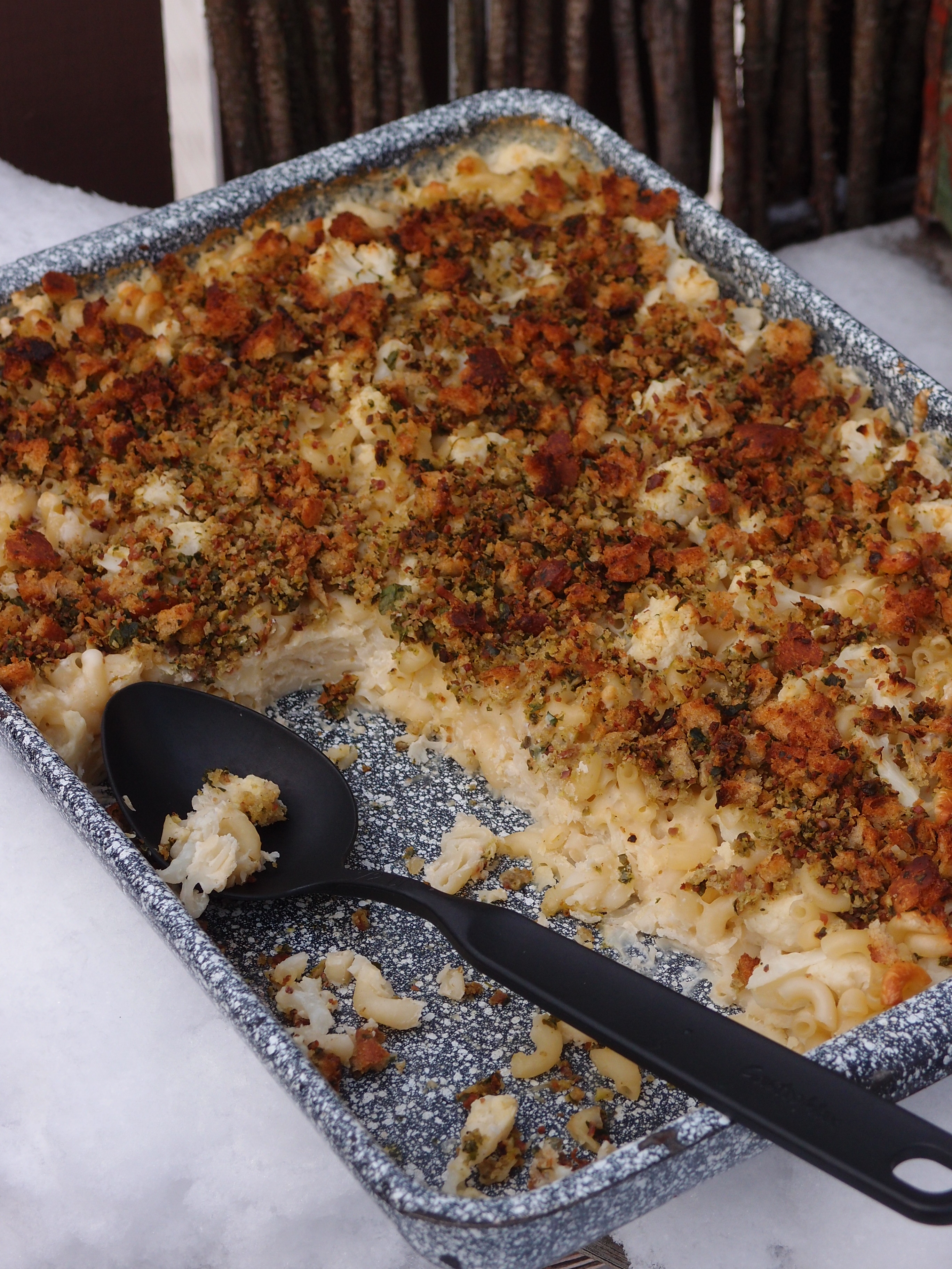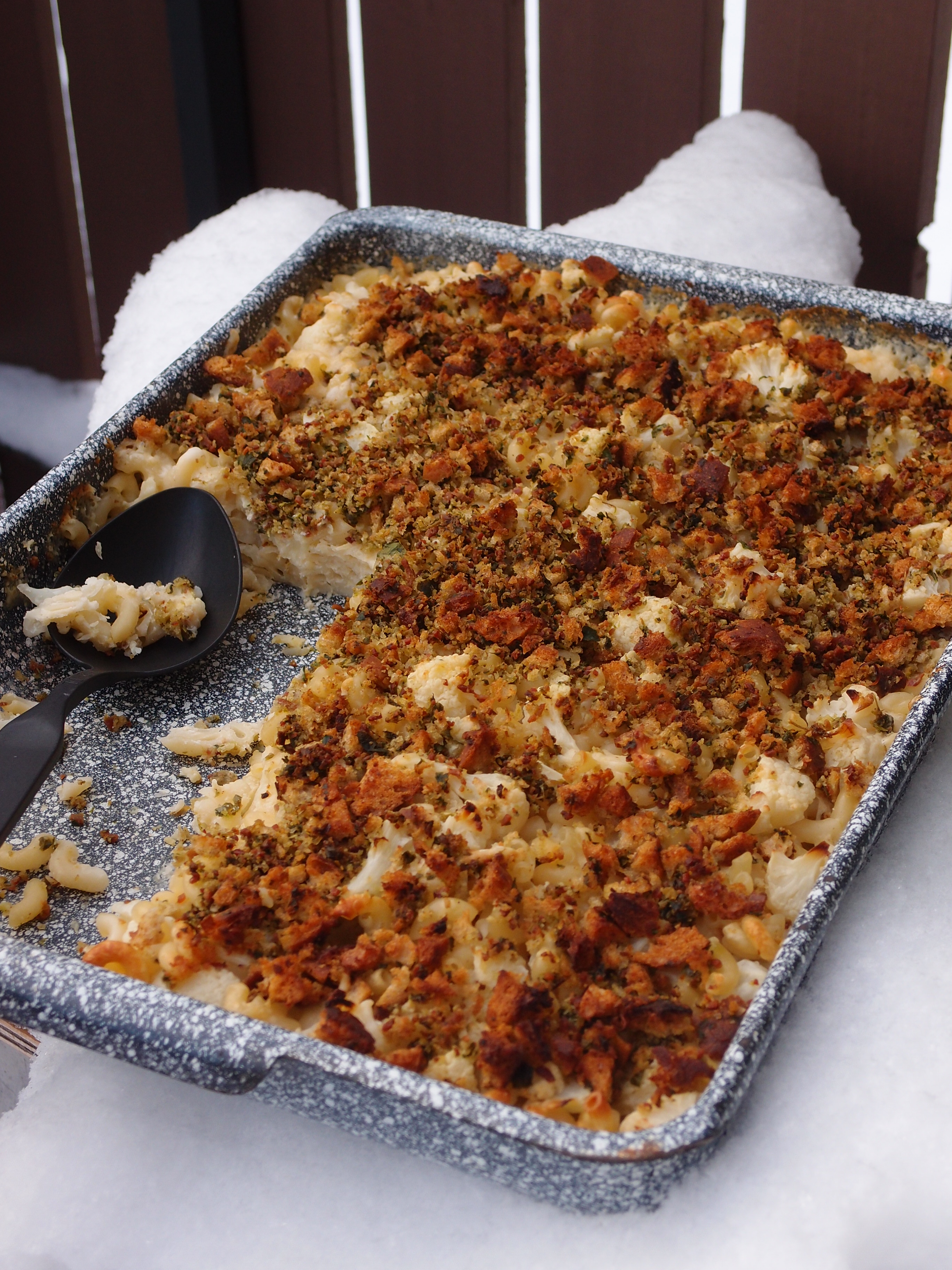 Förvänta dig krämigt gratinerade makaroner och blomkålsbuketter med en topp av ströbröd som är smaksatt med bacon, örter och vitlök. Mjuk, ostig, saftig och mycket god! Nylagad, håller den inte ihop som en låda dock. Nästa gång jag gör den här – för det kommer absolut bli fler gånger – ska jag dubblera ströbrödstoppingen. Den var bara för god och mycket av smaken sitter just där. Kanske jag också ökar på mängden grädde en aning – för vätskan sugs nämligen in i makaronerna och blomkålen och kanske kunde den varit ändå lite ”geggigare”. Är väl en smaksak det där och så beror det ju på vad man serverar till. Finns en sås med i bilden är det bara bra om den här rätten inte blir för blöt.
