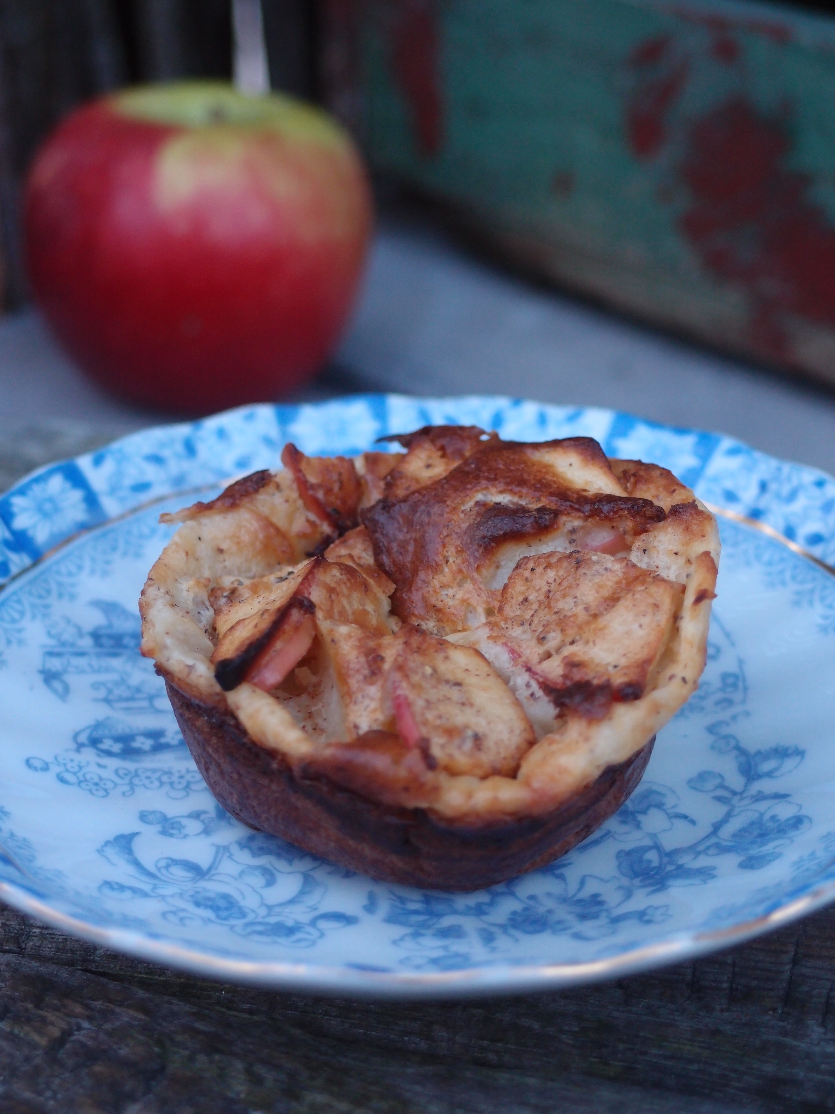 Tips! Det är jättegott att sticka ner tunna skivor av äpplen i smeten som först har vänts i kanel- och kardemummasocker. Får du socker över så strö lite över ytan också.↓