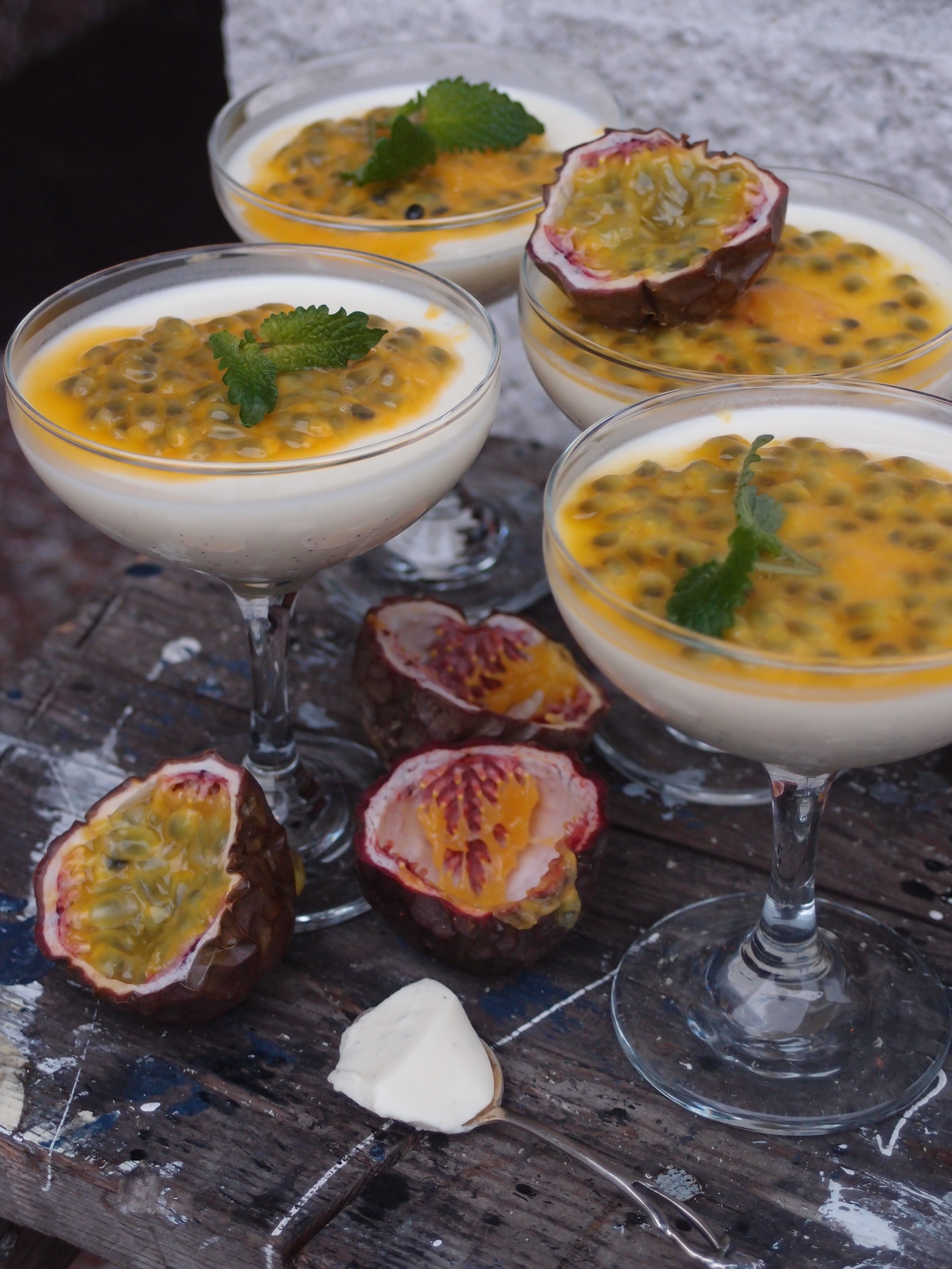 Vit chokladpannacotta med passion, det behövs inte mycket mer än så.