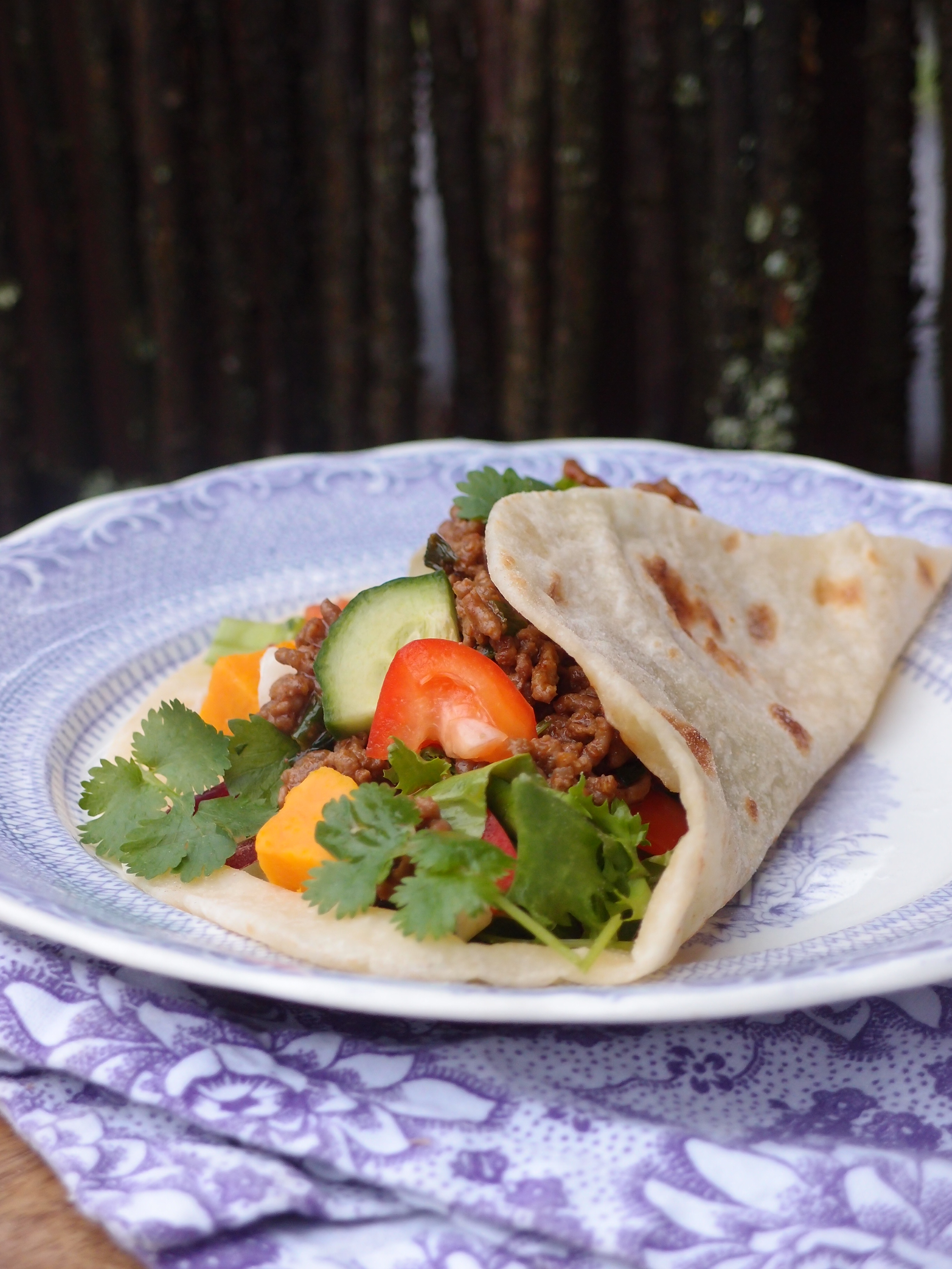 Köttfärsen fick sällskap av tacokrydda hot och klippt gräslök. Dessutom toppade vi det hela med sötpotatis. (Kokt eller ännu hellre ugnsbakad med olja och flingsalt).