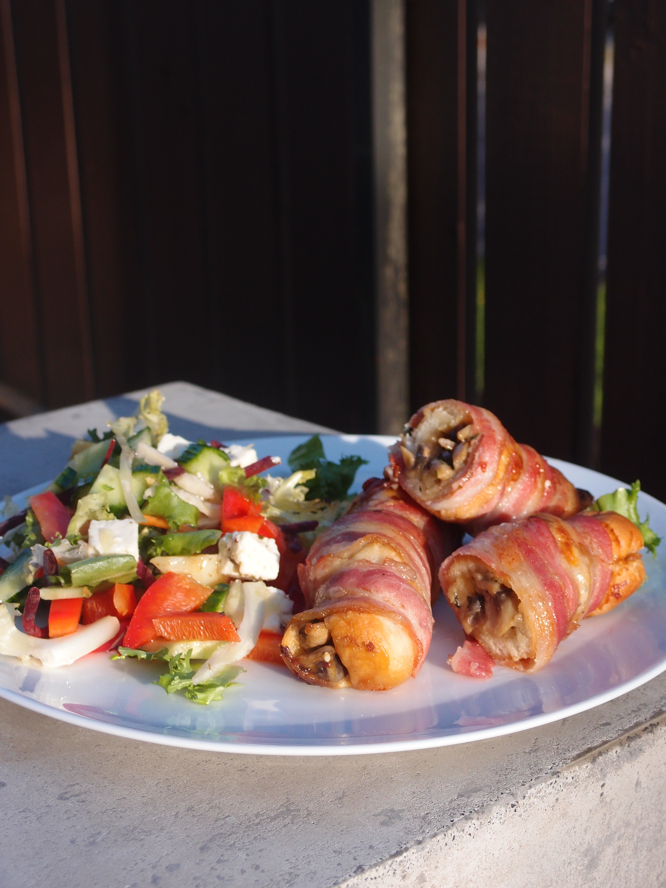 Jag hade svamp hemma och gjorde en champinjonstuvning (torrstek skivad svamp tills vätskan försvinner, tillsätt lök och smör och låt fräsa, addera grädde, crème fraîche, svampbuljongtärning, svartpeppar och ev någon färsk ört och låt puttra på några minuter), fyllde korvbröd med stuvningen, rev över ost och lindade in bröden i bacon. Det här fick gratinera på 200° varmluft i ca 20-25 minuter – tills baconet fått färg och blivit krispigt. Serverades med sallad och iskall mjölk.