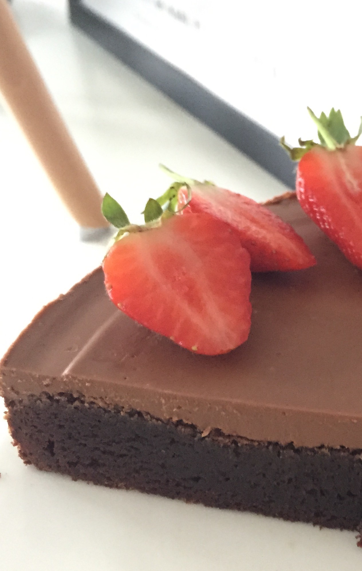Klassisk kladdkaksbotten är täckt med en lent, sött och mäktigt täcke av nougat. Mycket gott tillsammans! Kakan är lätt att skära i snygga bitar. Vill du addera lite textur så är hackade (karamelliserade) hasselnötter eller en påse Daimkulor en bra idé att toppa med.