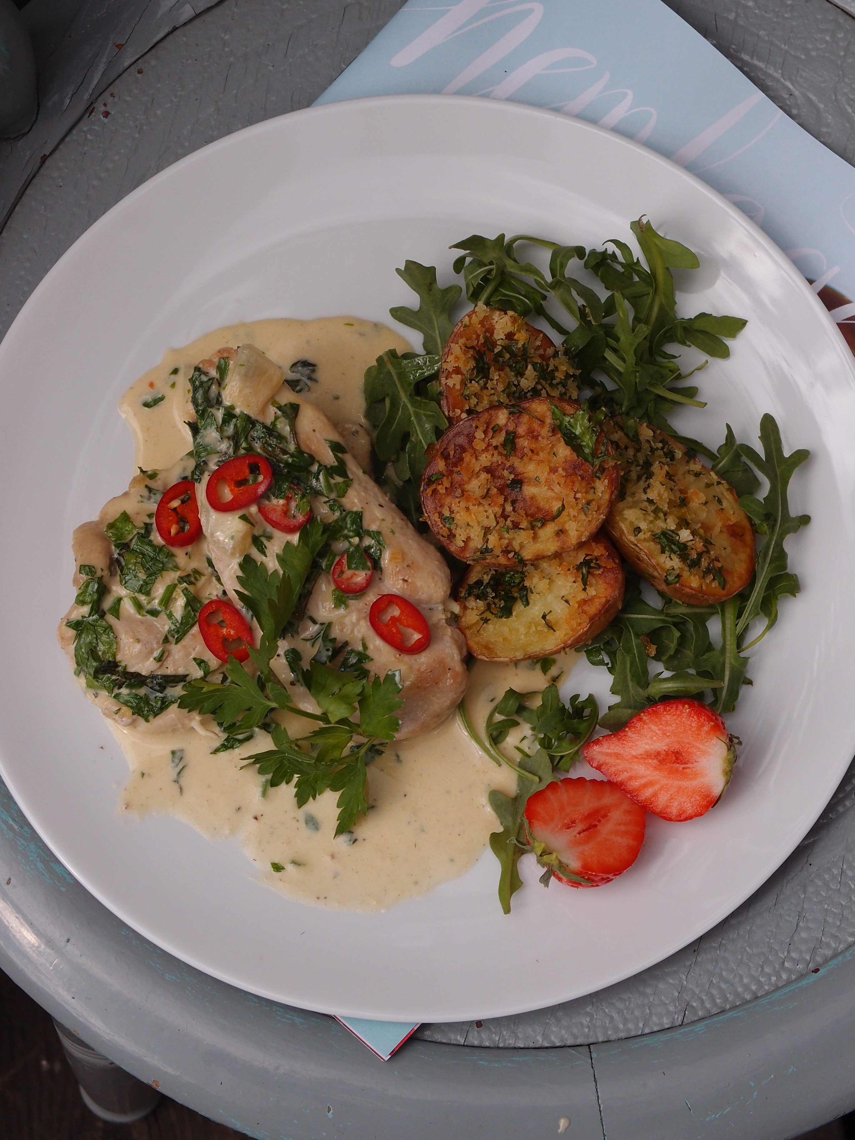 Dagens middagstips är en underbar rätt med kyckling och potatis. Vad sägs om kyckling i dijonsenapsås med massor av färska örter och till det ugnsrostad potatis toppad med frasig panering? Återigen blev jag inspirerad efter en lunch på stan då vi konstaterade att potatis ÄR gott till kyckling. För oss blir det i princip alltid pasta, ris eller gryn till just det vita köttet.