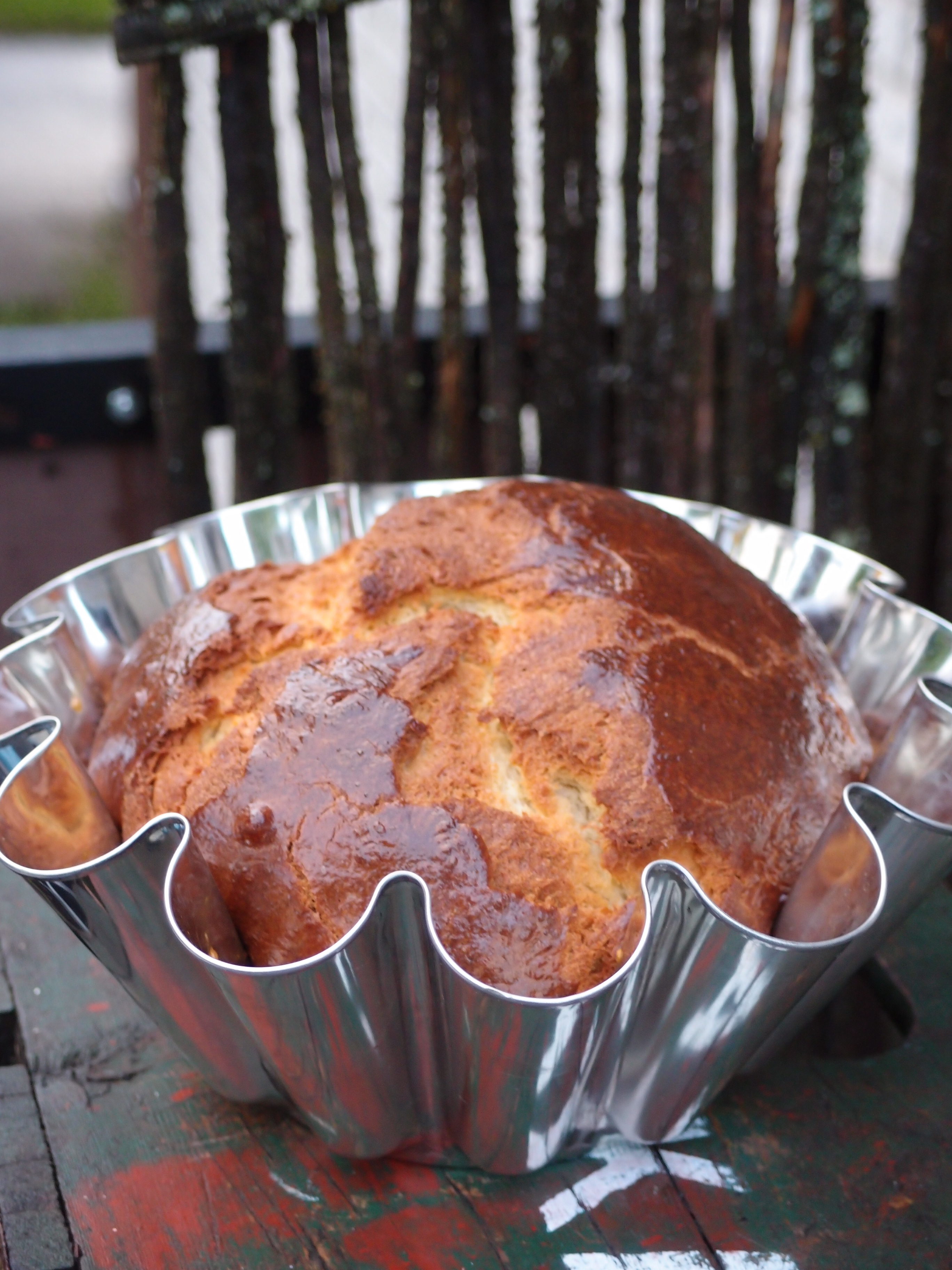 Forma degen till 3 runda bullar eller 2 avlånga bröd och lägg dem i väl smorda formar. Jag valde att göra ett stort bröd som jag lade ner i en oljad briocoheform. (Du kan också göra portionsbröd i exempelvis en oljad muffinsplåt).