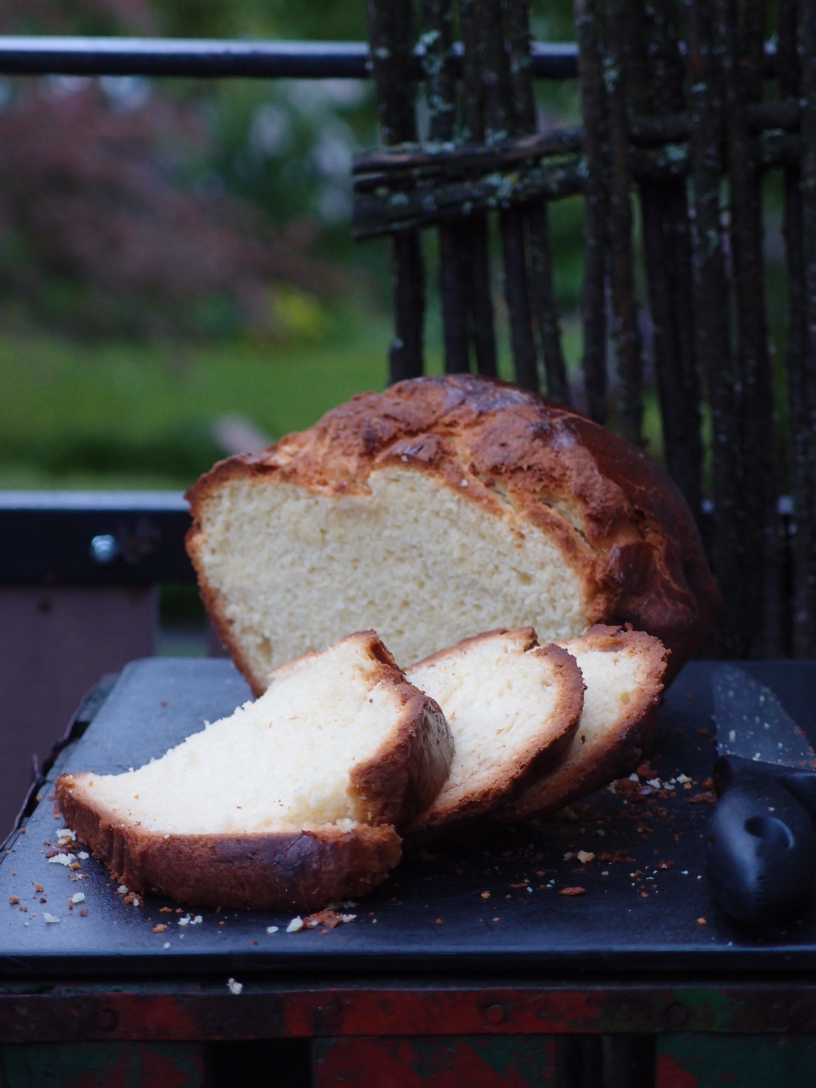 Jag har läääänge tänkt baka brioche men inte riktigt fått det gjort. Så när regnet bokstavligen smattrade ner en hel jäkla dag så tog jag tag i projektet. Har du provat brioche? Det är som en blandning av bröd och mindre söt sockerkaka kan man säga. Trots att det innehåller mycket smör och har en god smörsmak ska det inte ge fettkänsla i munnen. Hemligheten är att smöret ska jobbas in lite i taget när degen är färdigarbetad. Dessutom ska det jäsas länge för att få ett luftigt inre. Man äter det helt enkelt som det är, med marmelad, rostat eller kanske smörstekt med skagenröra.