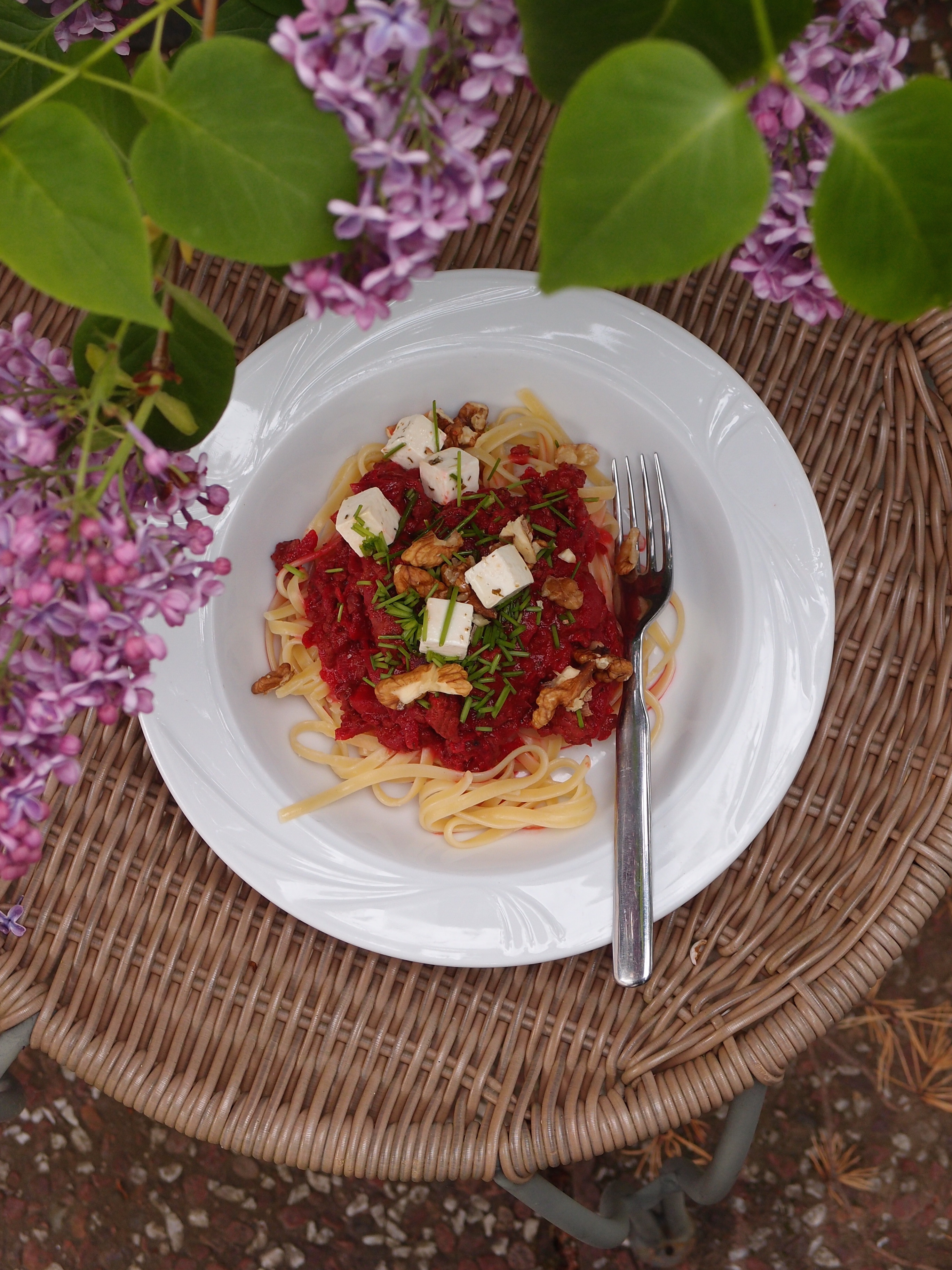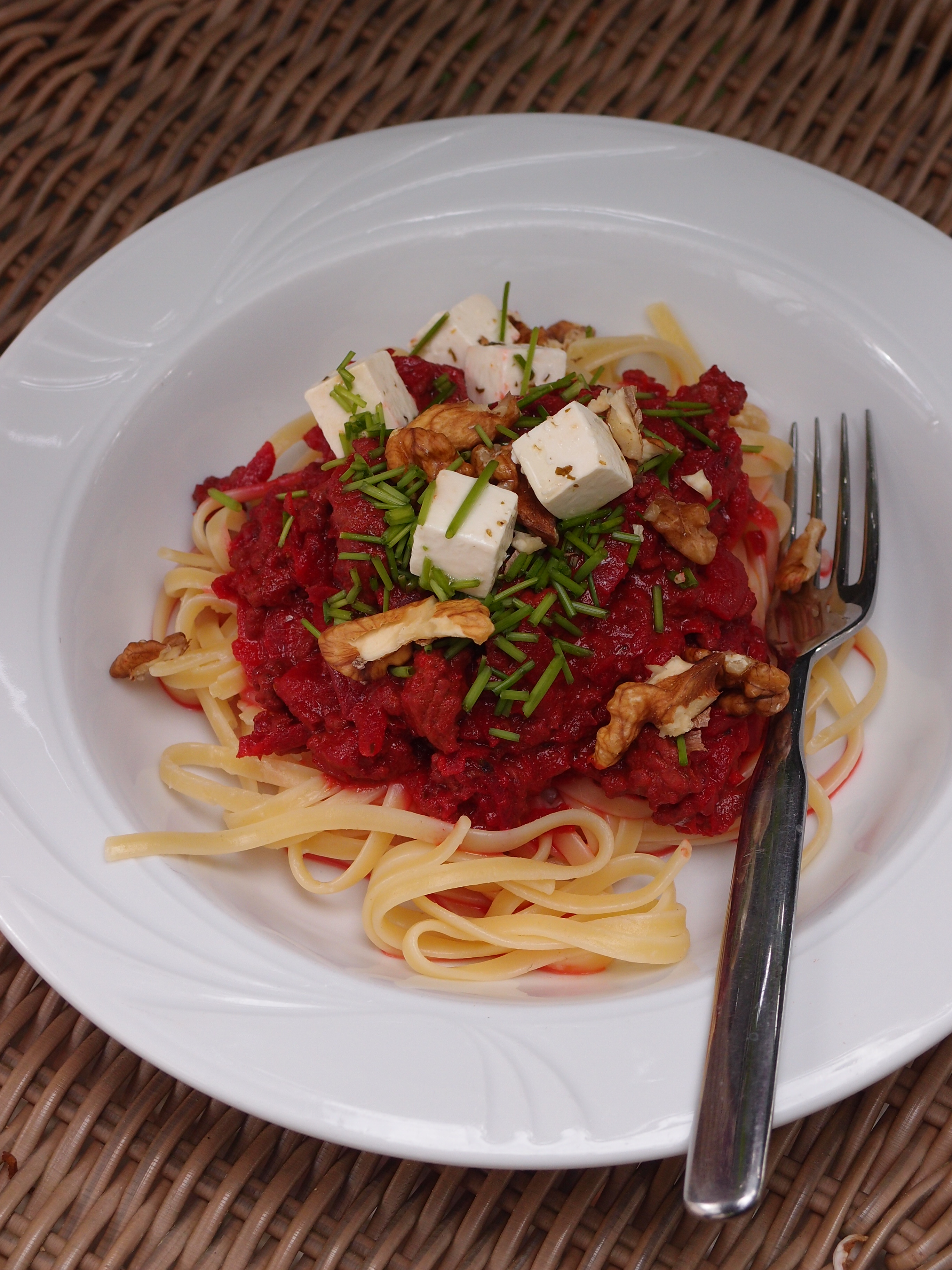 Såsen innehåller följande: ca 500 g nötfärs, 1 gul lök, 2 rårivna (stora) rödbetor, ca 500 g tomatkross, kryddor som salt, peppar, köttbuljong, Kikkoman soja, HP-sås, oregano, sweet chilisås, rödvinsvinäger och en skvätt grädde. Oftast toppar jag med riven ost men idag passade det bra med gräslök, valnötter och marinerad fetaost.
