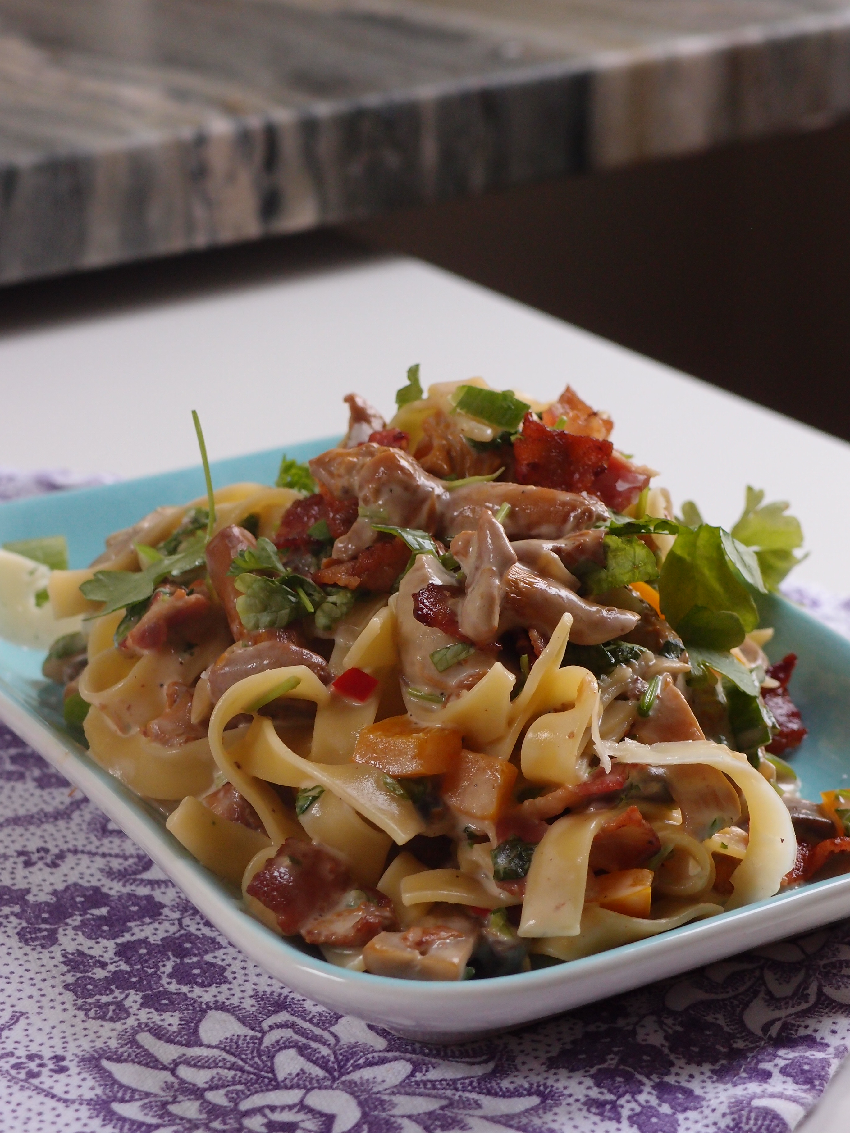 Hacka löken och stek den mjuk i smör. Skiva svamparna och torrstek dem i en stekpanna tills vätskan försvinner. Tillsätt lök och smör och låt fräsa en stund tillsammans med hackad paprika. Tillsätt grädde, fraîche, soja, och buljongtärning och låt puttra samman till en sås. Smaka av med svartpeppar, ev salt och gärna en skvätt av pastavattnet.