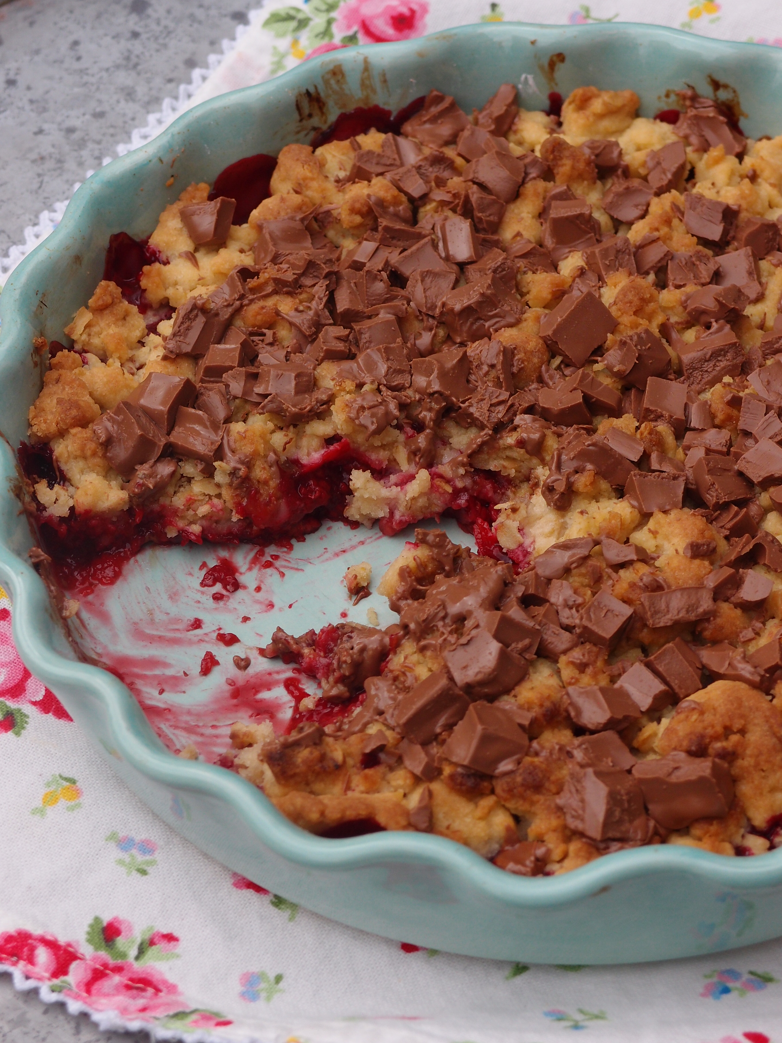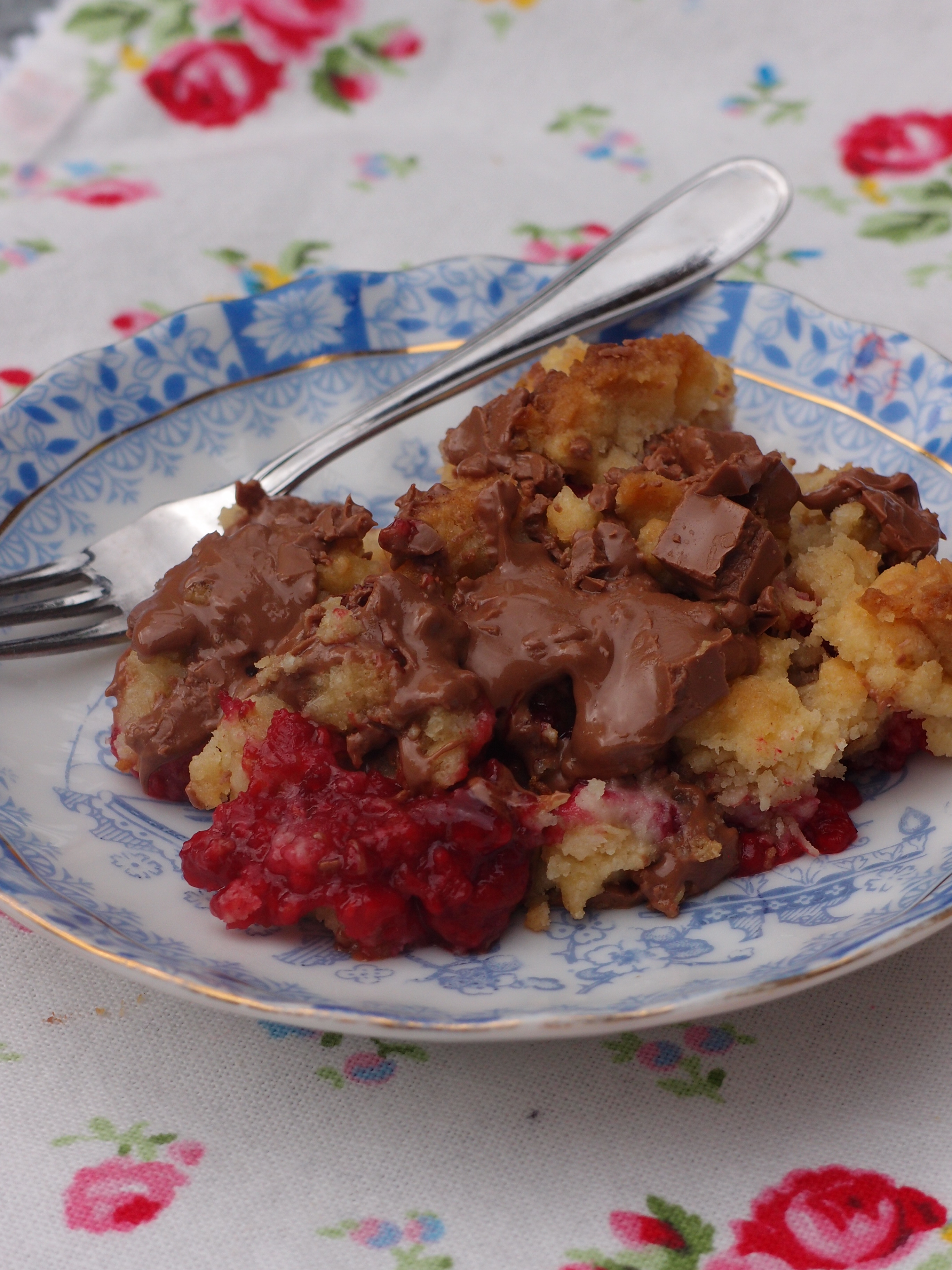 Idag bjuds det på hallonsmulpaj med en touch av choklad på toppen. Den där lilla mängden choklad gör mer än man tror för att pajen ska kännas lite annorlunda. Prova, den är ljuvlig!