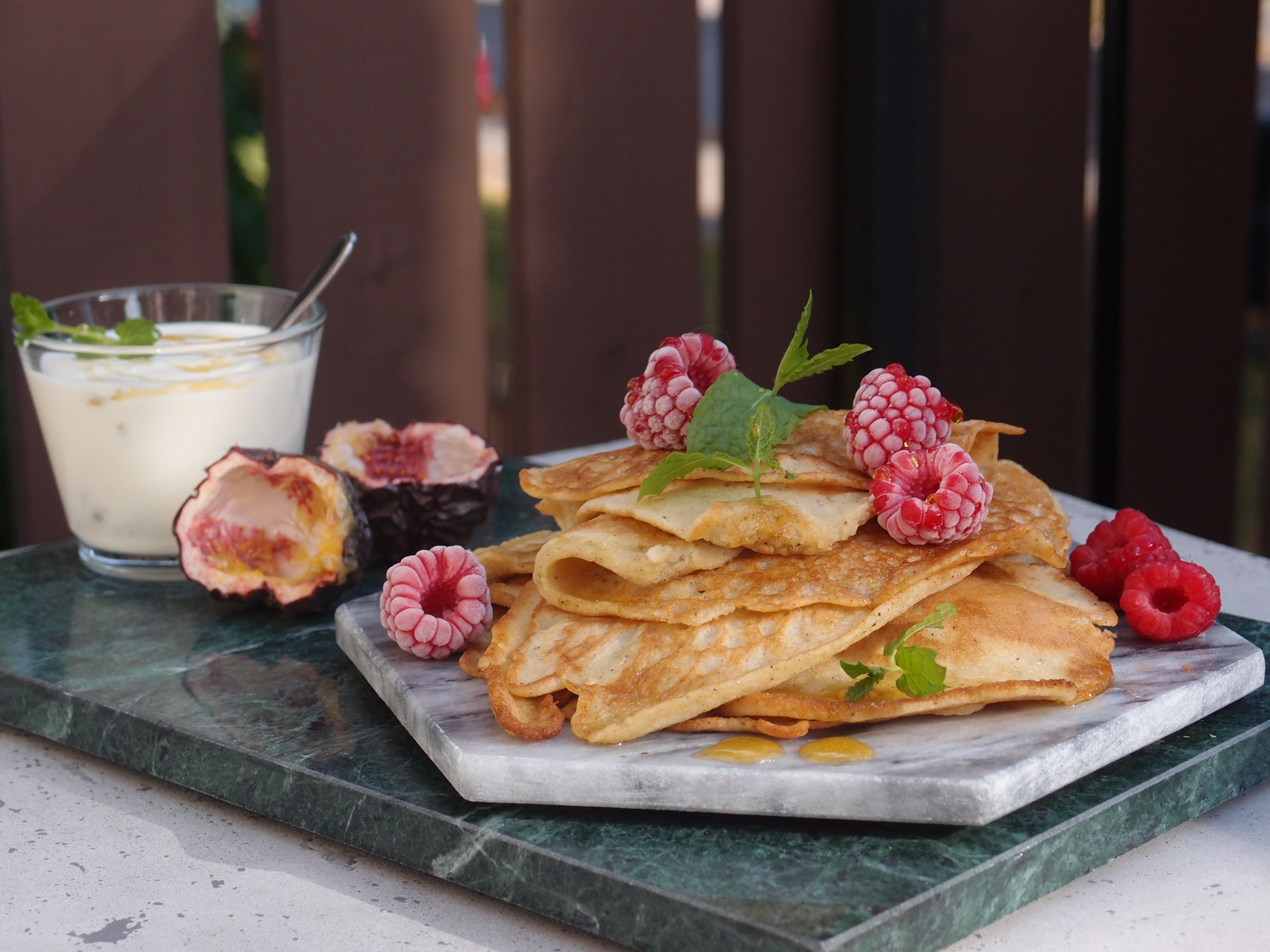 Passionsyoghurt (2 dl yoghurt 10 %, inkråmet ur 2 skrynkliga passionsfrukter och 2 tsk honung), lönnsirap, mynta och hallon blev urgoda tillbehör!