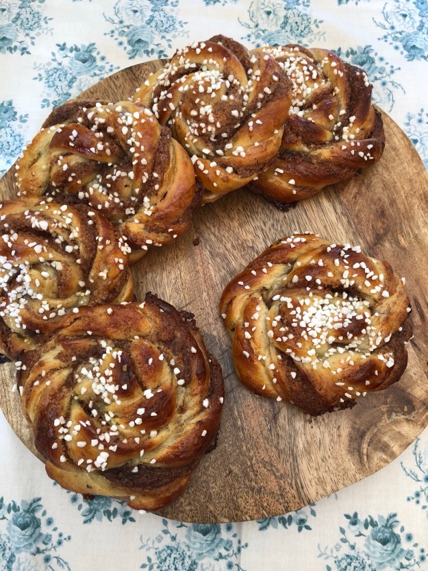 Visst ser de proffsiga ut! Men de är busenkla att göra kan jag lova. Degen kavlas ut, fylls, viks i tre lager och skivas i remsor som delas i två ”byxben” som först snurras runt varandra och sist runt till en rund snurra. Resultatet är himla vackert och man får alla bullarna lika fina dessutom.