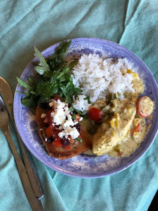 Hade mina föräldrar på besök under den här middagen och slog till på en liten brushetta-aktig toast också. Råddade fram den lite på måfå då vi hade så lite sallad hemma. Bröd stekt i olivolja, smör och vitlök. Toppat med en blandning av tomat, basilika, oliver, salt, socker, vit balsamvinäger och lite fetaost.