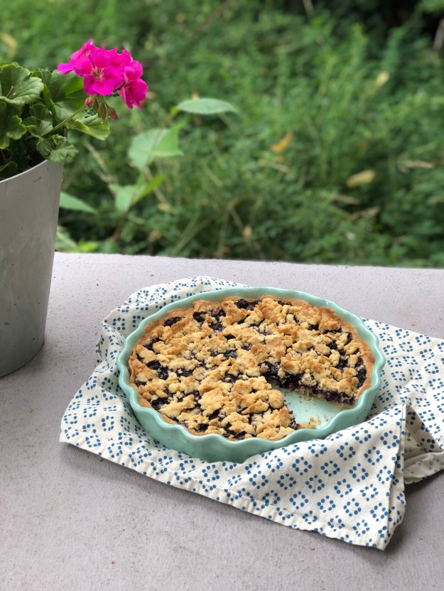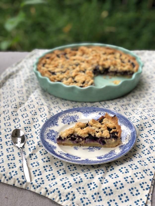 Jag valde att ta undan en del av vaniljkrämen och servera den vid sidan av. Men man gör lite som man vill med den biten! Nästa gång låter jag all kräm bakas i pajen.