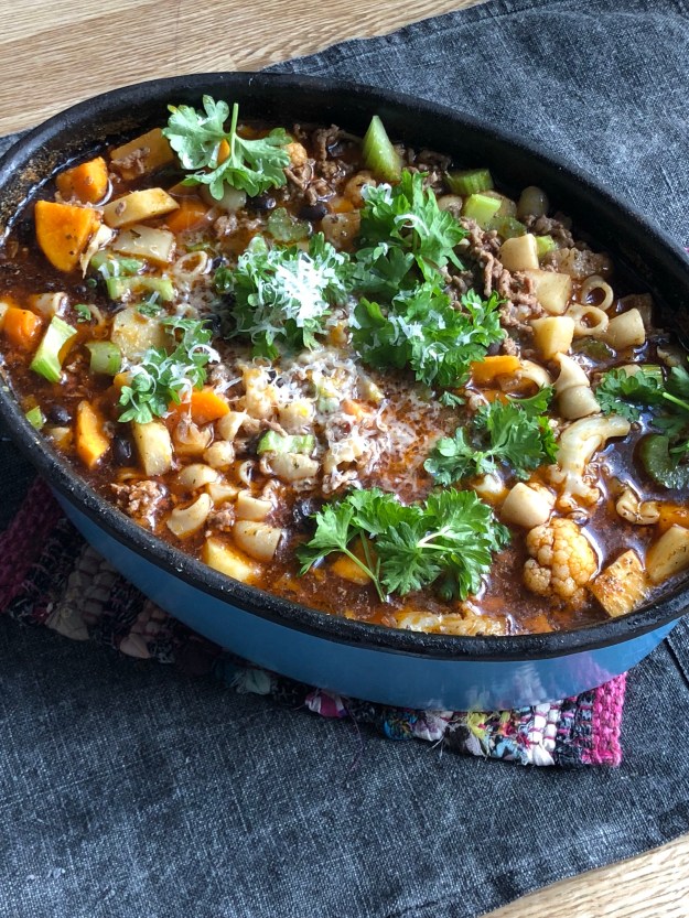 Blir alltid sugen på värmande soppor under hösten. Köttfärssoppa är vi rätt dåliga på at äta här hemma och det är lite synd för det är himla mustigt och gott. Här kommer ett recept med massor av smakrika rotfrukter och makaroner.