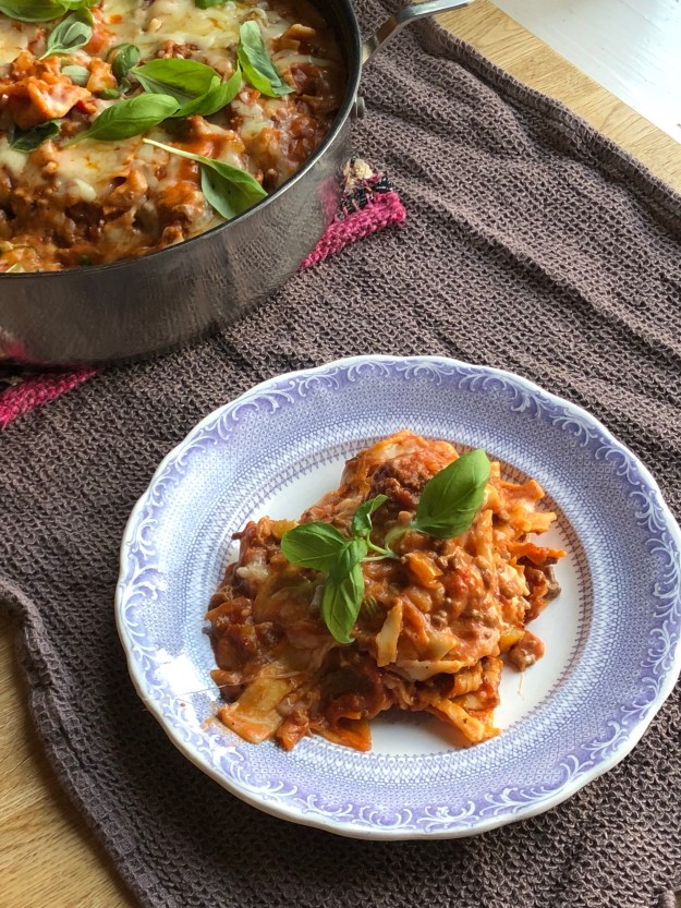 Hemlagad lasagne på drygt 30 minuter? Utan att värma på ugnen? Jajjebox. Enkelt fixat i stekpannan! Skillnaden mot en klassisk lasagne i ugn är nog att den här är lite mer ”messy” och mer tomatbaserad. Men vad gör nu det när det nästan smakar likadant! Tipset hittade jag på bloggen Zeinas Kitchen, men hon använde crème fraîche och mozzarella i stället för bechamelsås. Ett tips i sig!