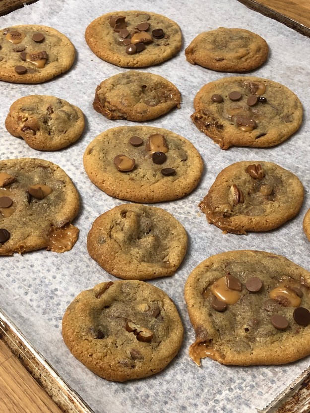 Det här blir en ganska stor sats för mina mått mätt så jag delar upp degen i flera delar innan choklad, nötter och godis tillsätts och sparar degen i kylen el frysen. På så vis har man en fin bas att utgå ifrån och smaksätta på olika sätt, med olika godis, nötter och typer av choklad. De här kakorna har en spröd kant och en seg kärna och är ljuvligt sega och goda.