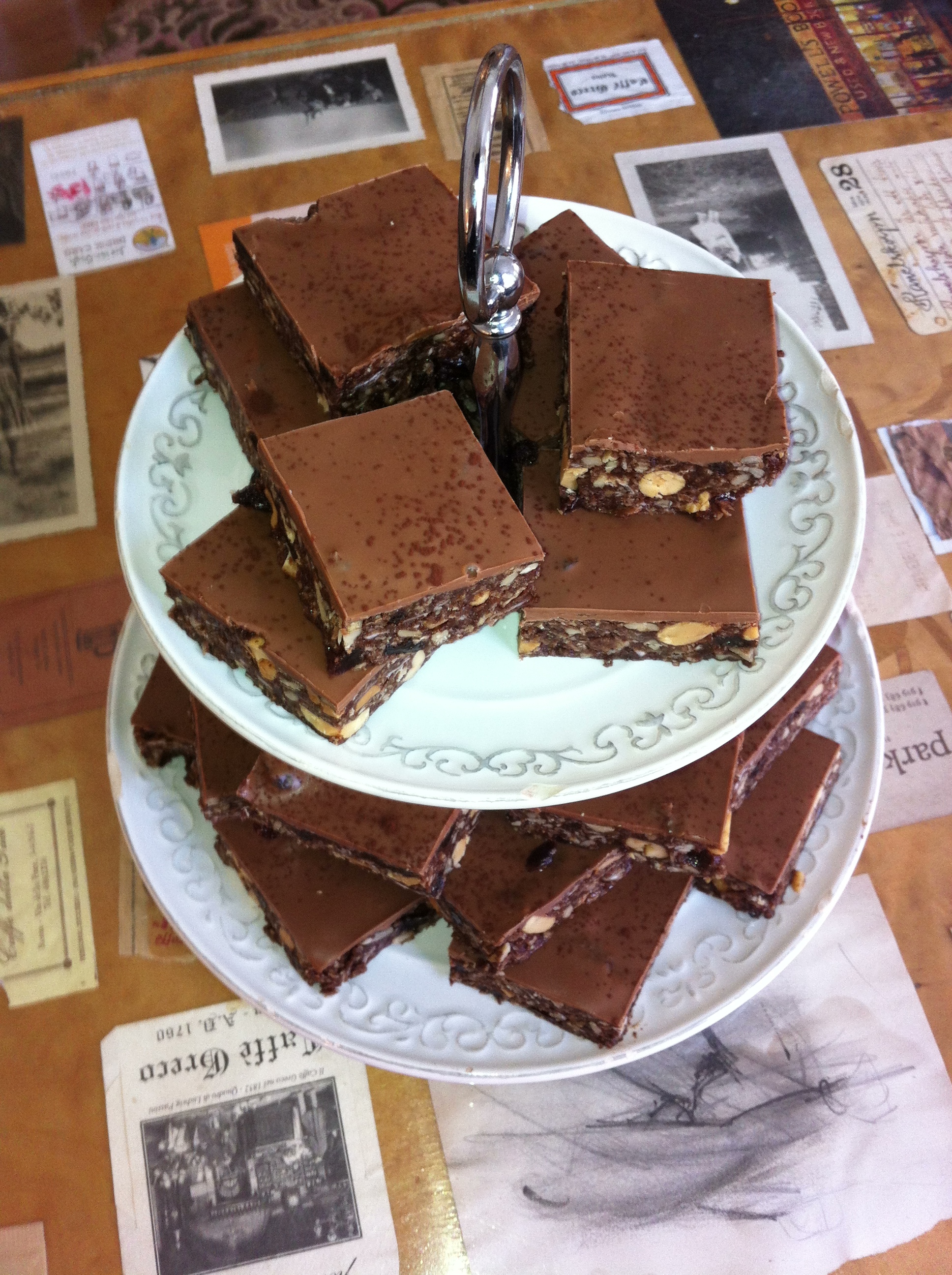 Jag smälte och strök ut kaffechoklad på en marmorplatta, kylde den och tog sedan hjälp av osthyveln för att flisa chokladen till rullar. Lite guldglitter kom väl till pass för att täcka skavankerna.