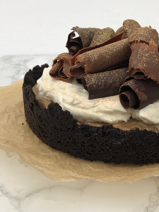 Spröd och knäckig chokladbotten möter vaniljkräm smaksatt med kaffe. Och på toppen ett generöst lager vispad grädde, förstås, och flisad kaffechoklad. Som en chokladpudding i pajformat, med kaffesmak.