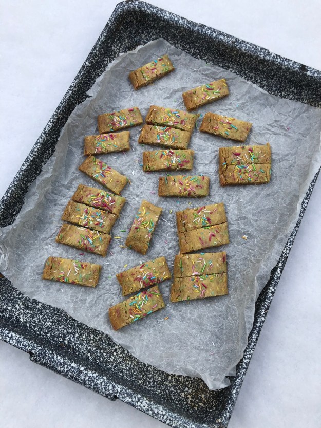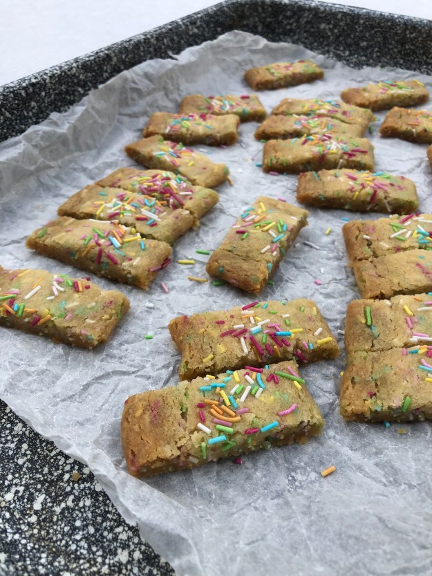 Vispa smör, socker, sirap, vanilj och salt krämigt. Blanda ner mjöl och bikarbonat och forma till en deg. Vänd försiktigt ner strösslet. Rulla ut till två längder på en plåt klädd med bakplåtspapper. Strö på lite extra strössel och platta till dem lite lätt. Grädda i mitten av ugnen i ca 8-10 minuter eller tills kanterna fått lite färg. Ju längre du gräddar desto knaprigare snittar. Jag föredrar dem sega! Skär i snittar innan de svalnat helt.